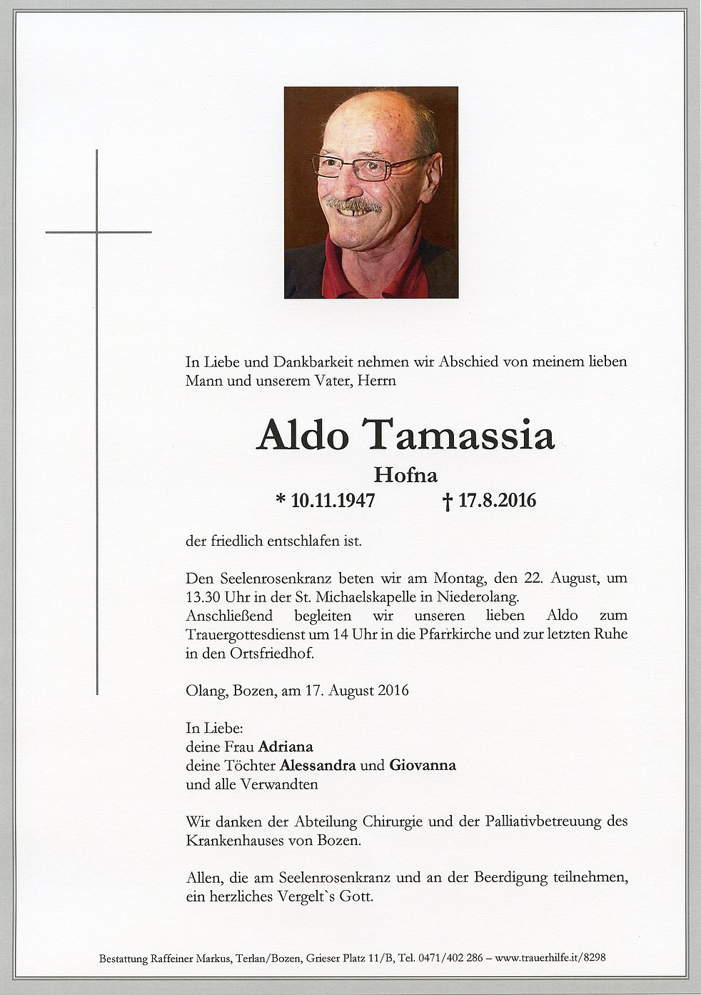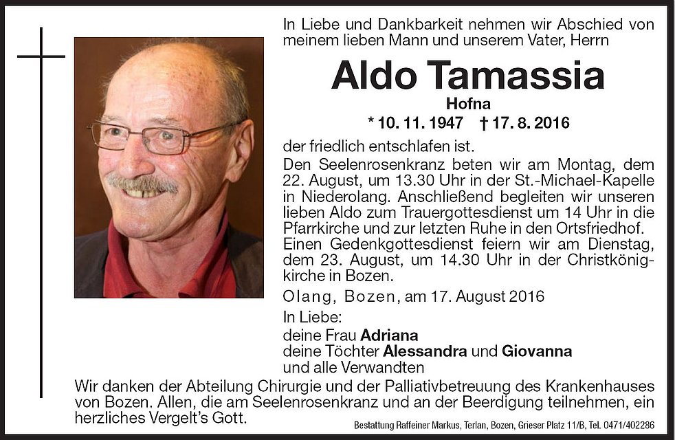 Den Seelenrosenkranz beten wir am Montag, den 22. August, um 13.30 Uhr in der St. Michaelskapelle in Niederolang. Anschließend begleiten wir unseren lieben Aldo zum Trauergottesdienst um 14 Uhr in die Pfarrkirche und zur letzten Ruhe in den Ortsfriedhof.