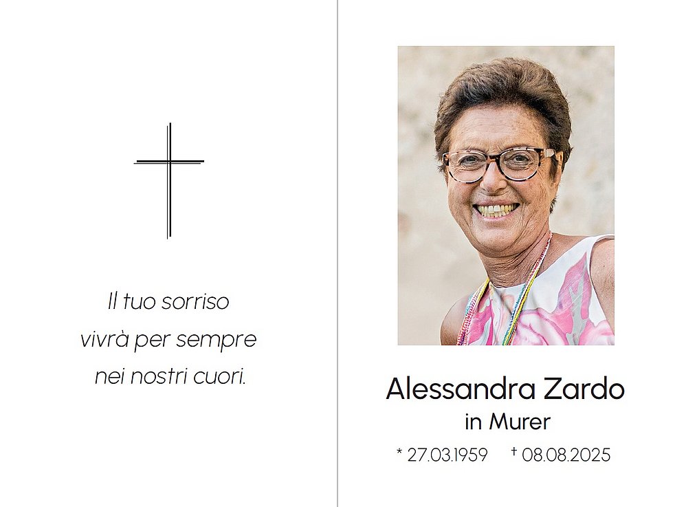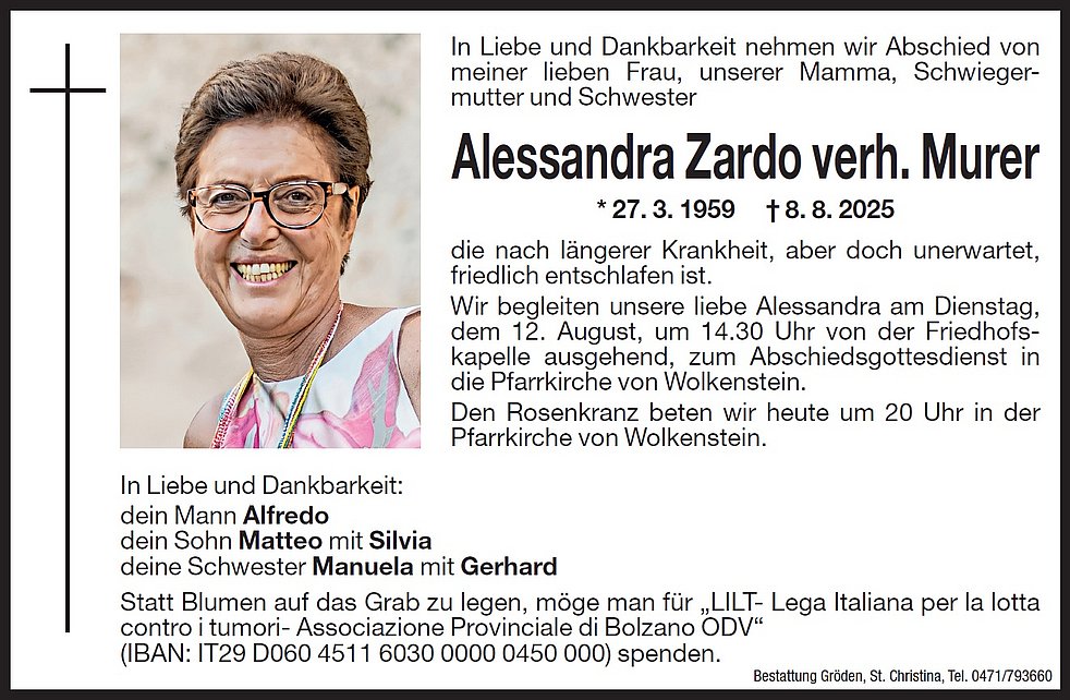 Wir begleiten unsere liebe Alessandra am Dienstag, dem 12. August, um 14.30 Uhr von der Friedhofskapelle ausgehend, zum Abschiedsgottesdienst in die Pfarrkirche von Wolkenstein.