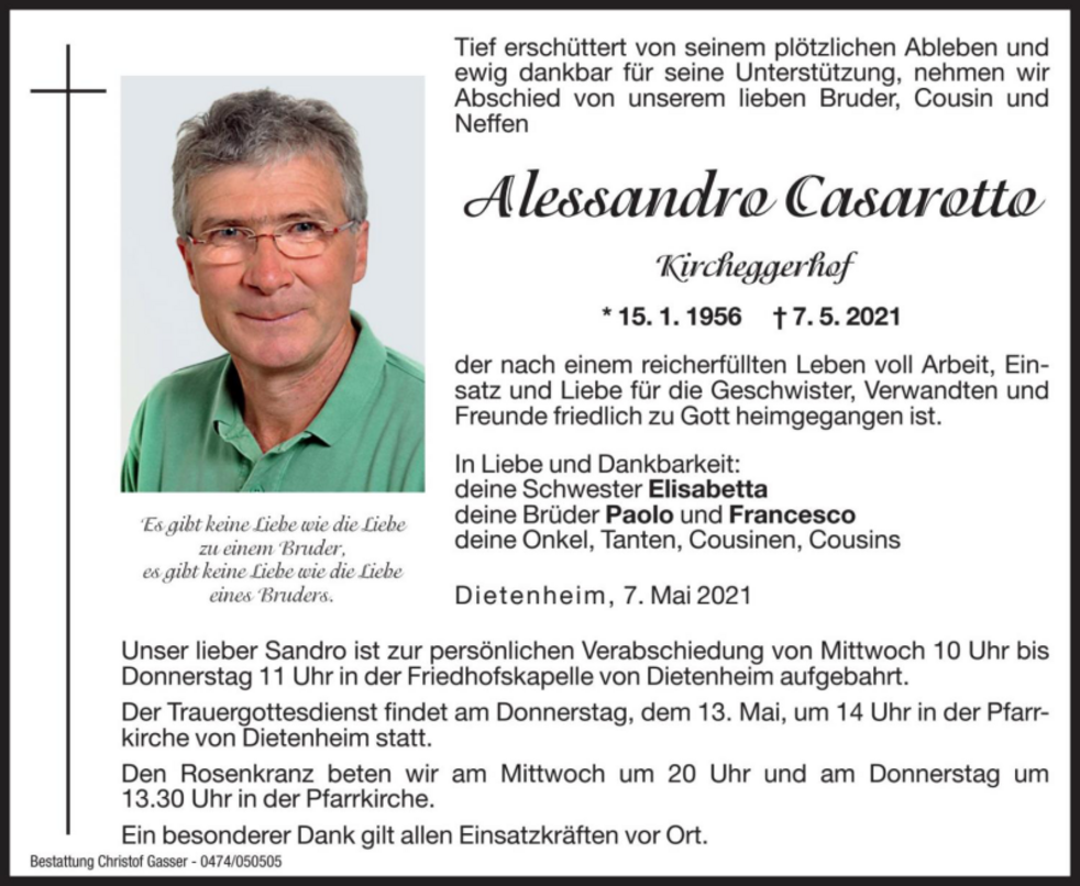 Wir nehmen Anteil am Schmerz, den Ihr durch den Verlust Eures lieben Bruder Sandro erlitten habt und drücken Euch unser aufrichtiges Beileid aus.