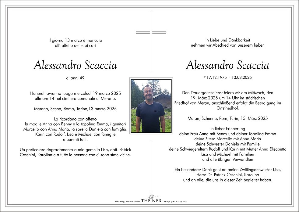 Den Trauergottesdienst feiern wir am Mittwoch, den 19. März 2025 um 14 Uhr im städtischen Friedhof von Meran; anschließend erfolgt die Beerdigung im Ortsfriedhof.