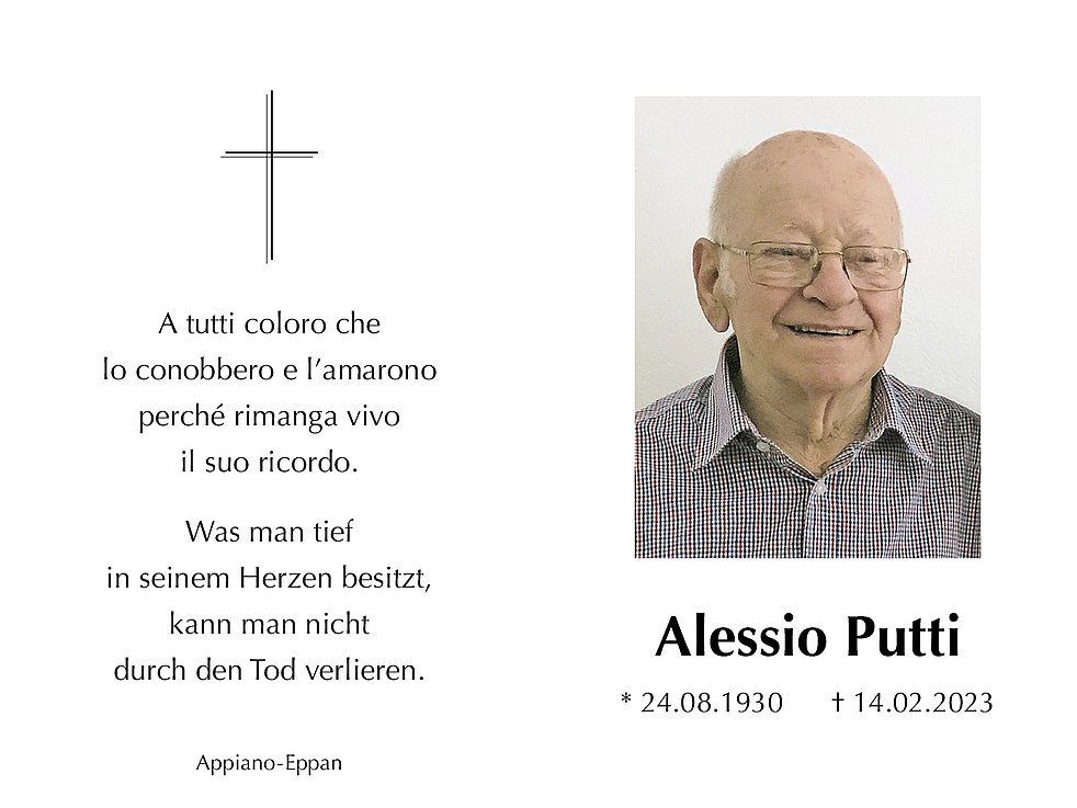 La S. Messa in suffragio verrà celebrata venerdì 17 febbraio alle ore 10.30 nella Chiesa Parrocchiale di San Michele/Appiano. Il seppellimento seguirà in forma privata al cimitero locale.