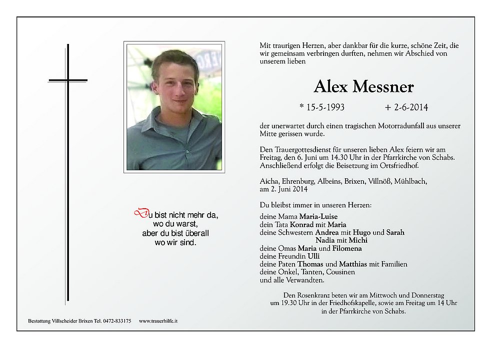Den Trauergottesdienst für unseren lieben Alex feiern wir am Freitag, den 6. Juni um 14.30 Uhr in der Pfarrkirche von Schabs. Anschließend erfolgt die Beisetzung im Ortsfriedhof.