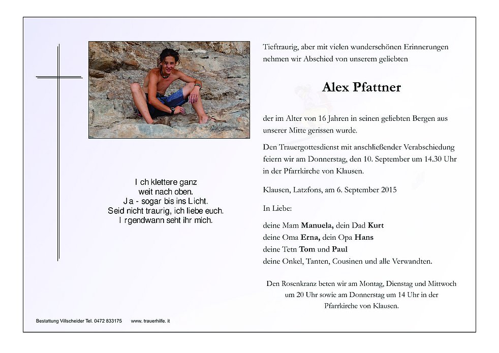 Den Trauergottesdienst mit anschließender Verabschiedung feiern wir am Donnerstag, den 10. September um 14.30 Uhr in der Pfarrkirche von Klausen.