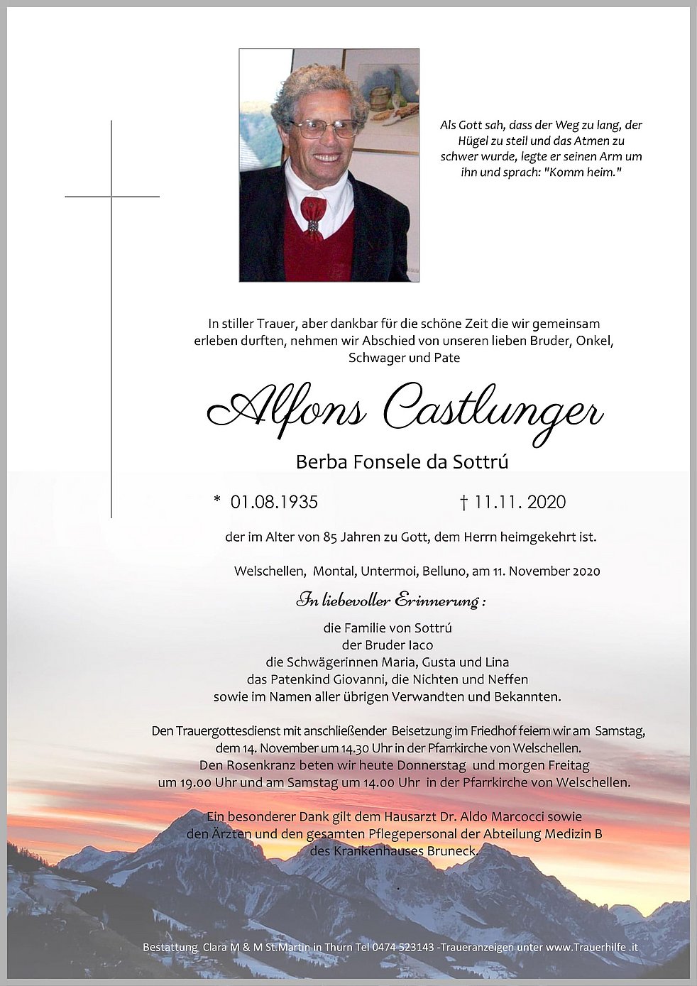 Den Trauergottesdienst mit anschließender Beisetzung im Friedhof feiern wir am Samstag, dem 14. November um 14.30 Uhr in der Pfarrkirche von Welschellen.