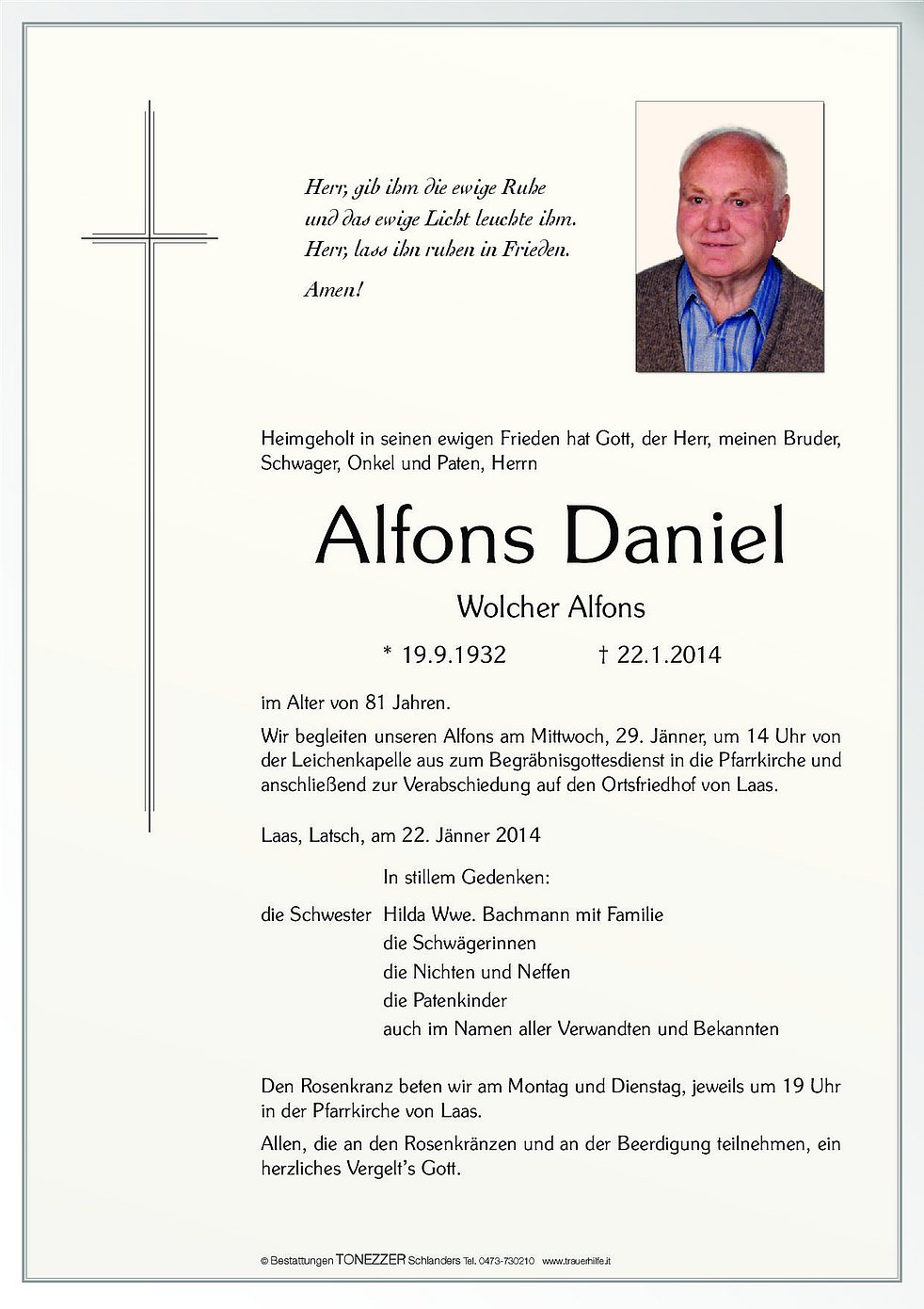 Wir begleiten unseren Alfons am Mittwoch, 29. Jänner, um 14 Uhr von der Leichenkapelle aus zum Begräbnisgottesdienst in die Pfarrkirche und anschließend zur Verabschiedung auf den Ortsfriedhof von Laas.