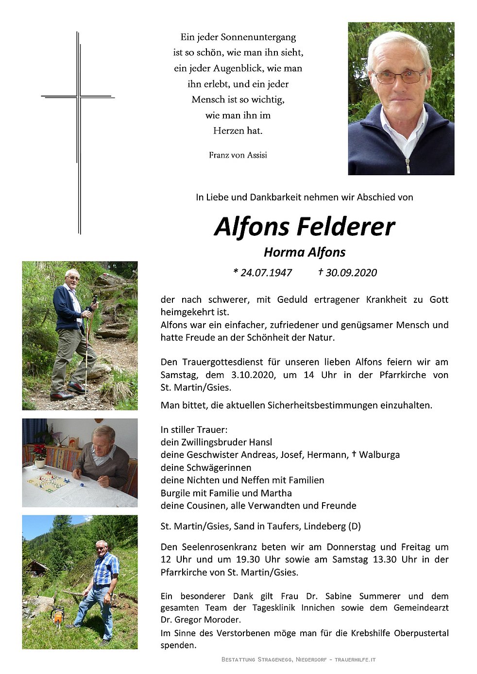 Den Trauergottesdienst für unseren lieben Alfons feiern wir am Samstag, dem 3.10.2020, um 14 Uhr in der Pfarrkirche von St. Martin/Gsies.