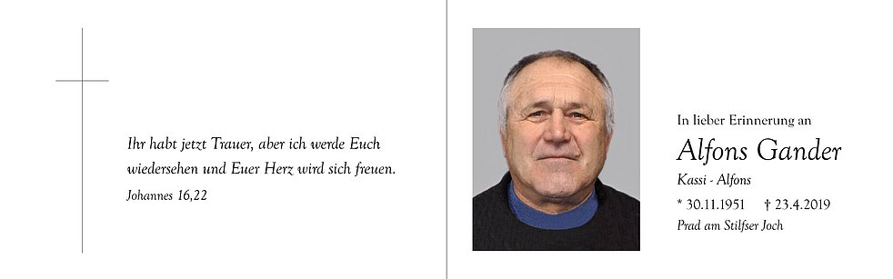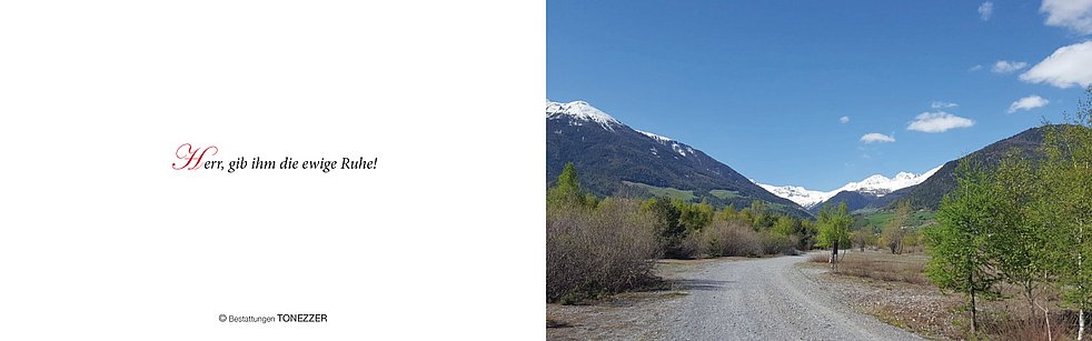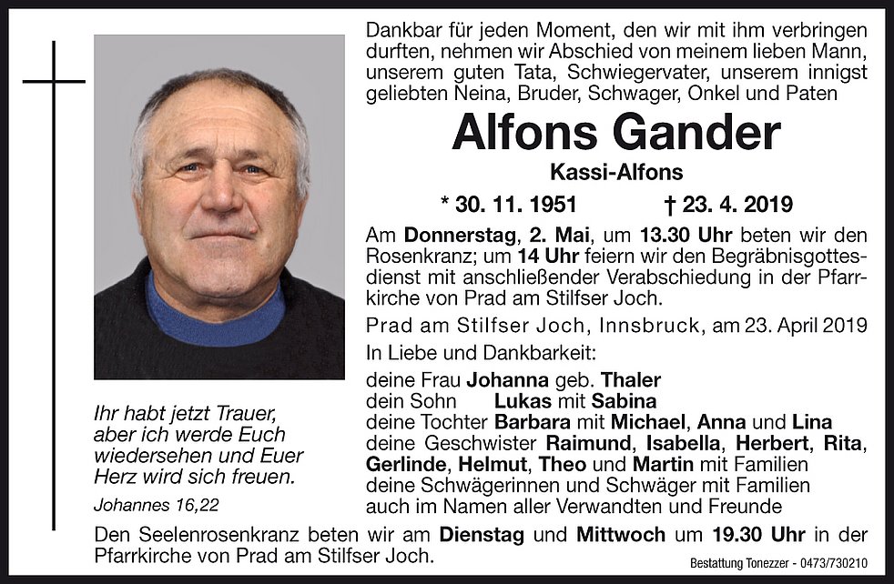 Am Donnerstag, 2. Mai, um 13.30 Uhr beten wir den Rosenkranz; um 14 Uhr feiern wir den Begräbnisgottesdienst mit anschließender Verabschiedung in der Pfarrkirche von Prad am Stilfser Joch.