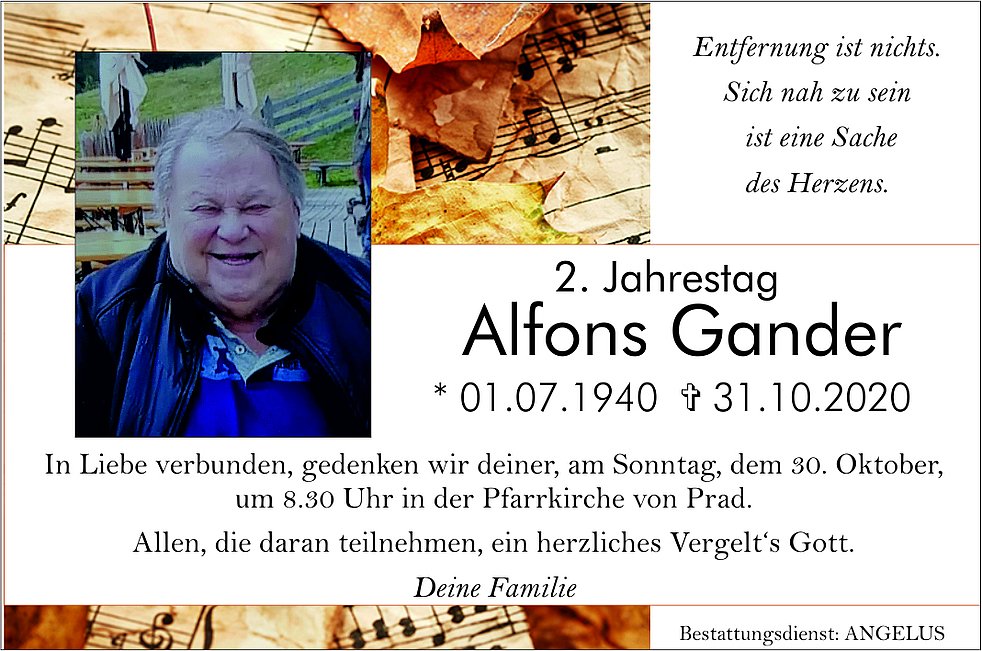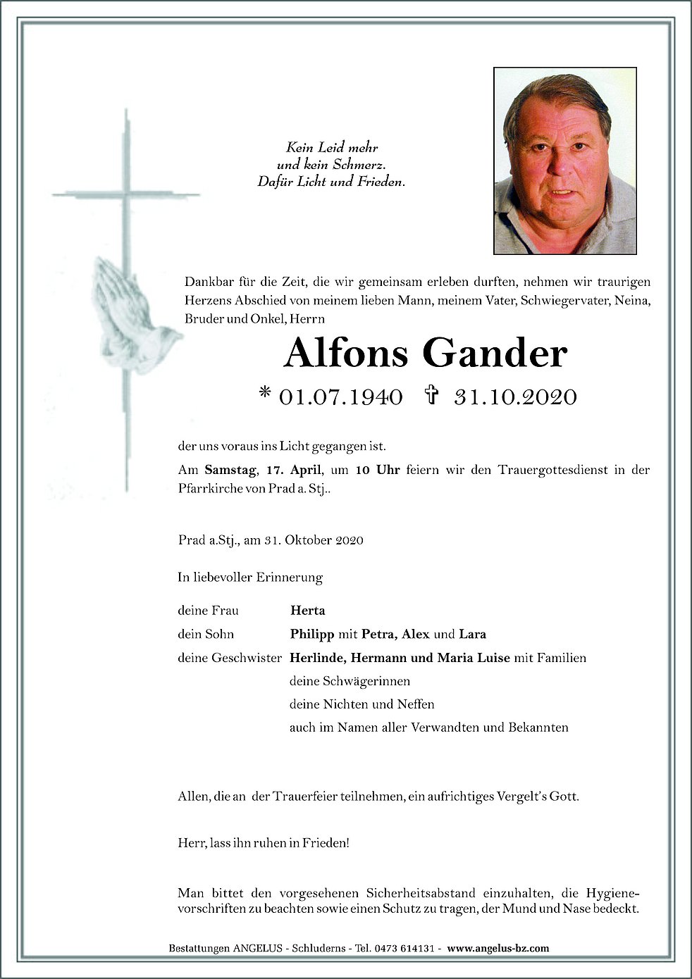 Am Samstag, 17. April, um 10 Uhr feiern wir den Trauergottesdienst in der Pfarrkirche von Prad a. Stj.