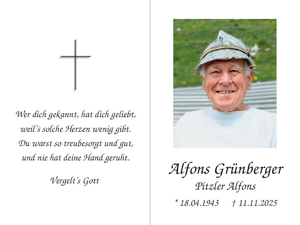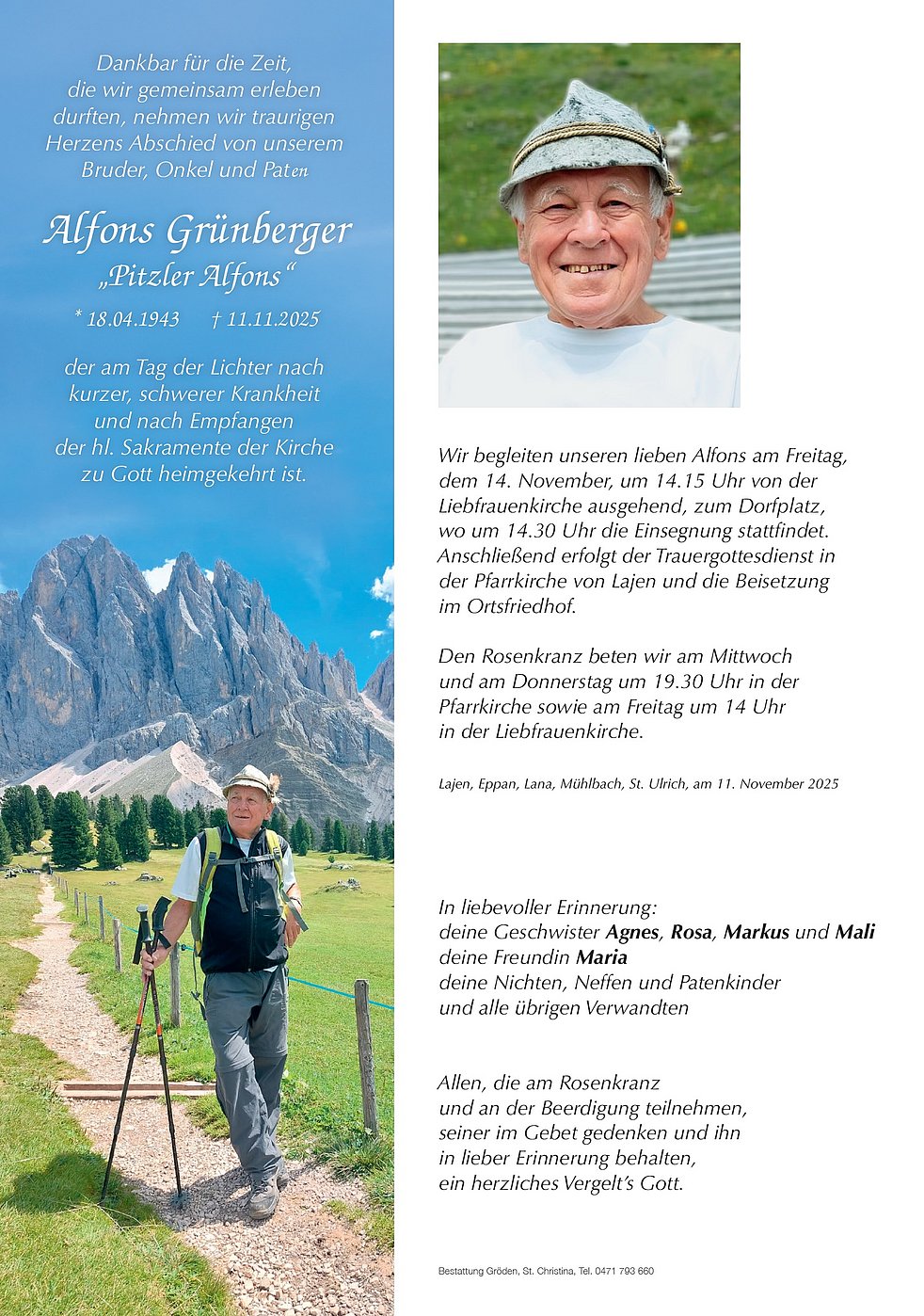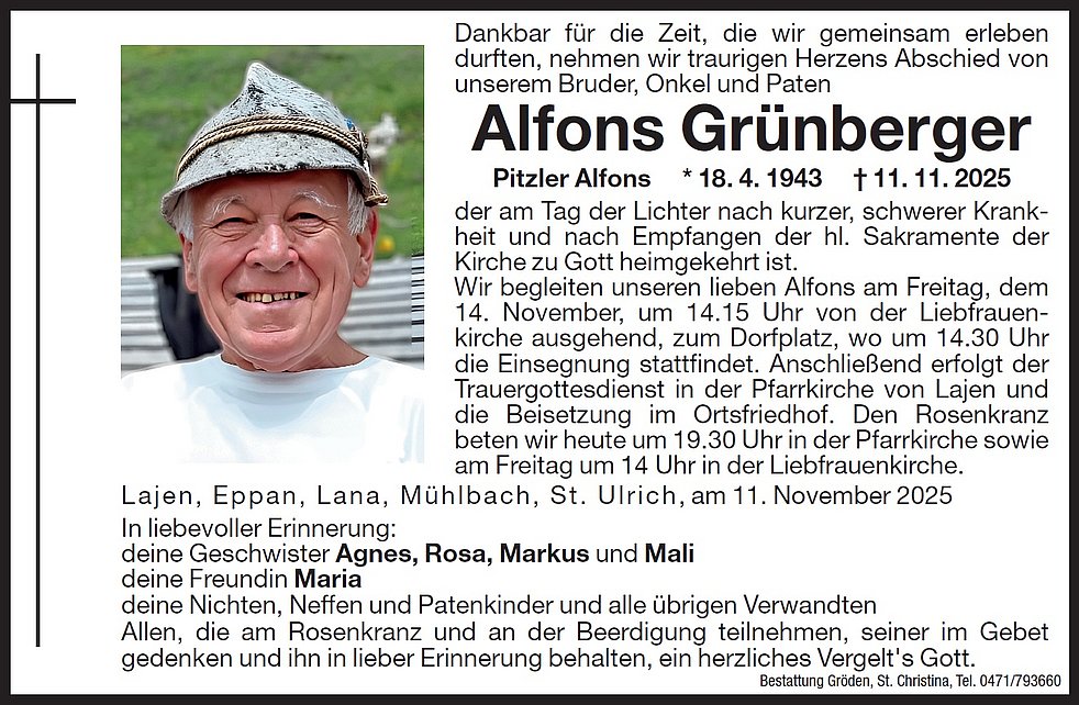 Wir begleiten unseren lieben Alfons am Freitag, dem 14. November, um 14.15 Uhr von der Liebfrauenkirche ausgehend, zum Dorfplatz, wo um 14.30 Uhr die Einsegnung stattfindet. Anschließend erfolgt der Trauergottesdienst in der Pfarrkirche von Lajen und die Beisetzung im Ortsfriedhof.