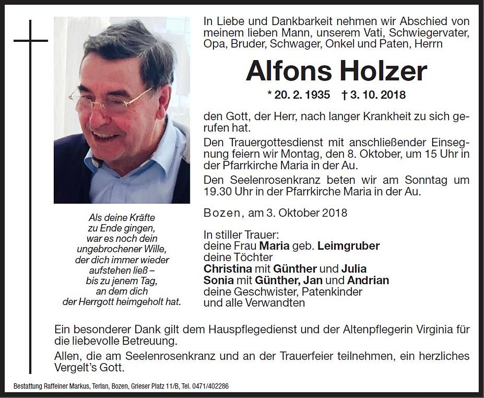 Den Trauergottesdienst mit anschlieβender Einsegnung feiern wir am Montag, den 8. Oktober, um 15 Uhr in der Pfarrkirche Maria in der Au.