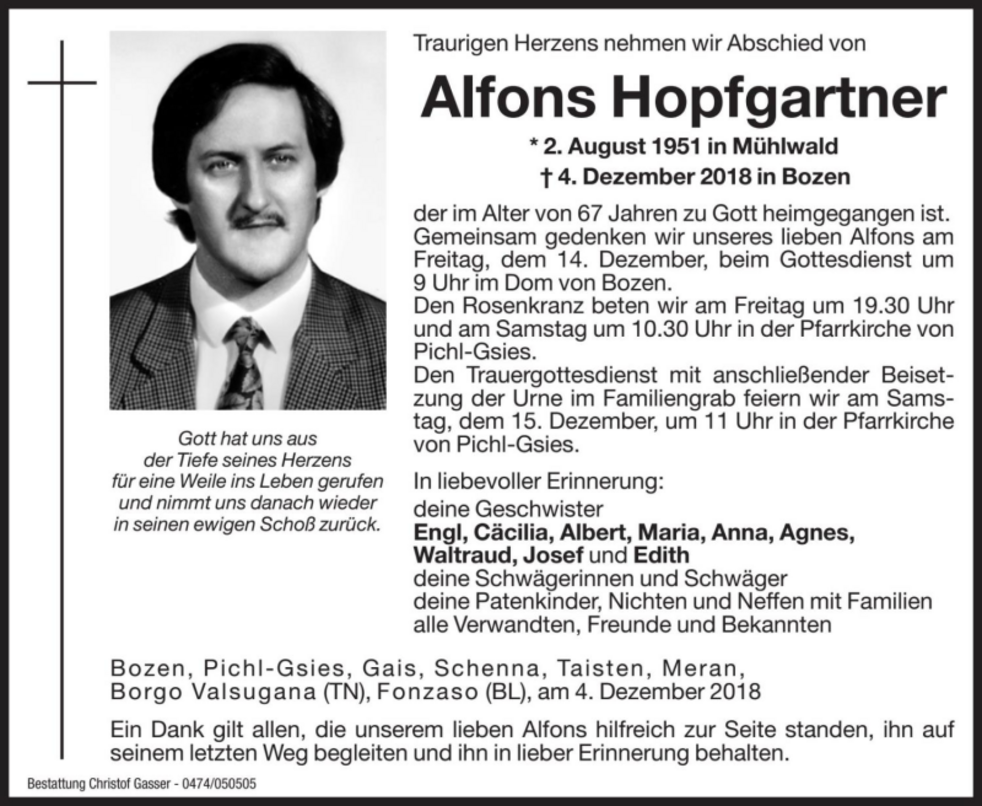 Den Trauergottesdienst, mit anschließender Beisetzung der Urne im Familiengrab, feiern wir am Samstag, dem 15. Dezember, um 11 Uhr in der Pfarrkirche von Pichl-Gsies.
