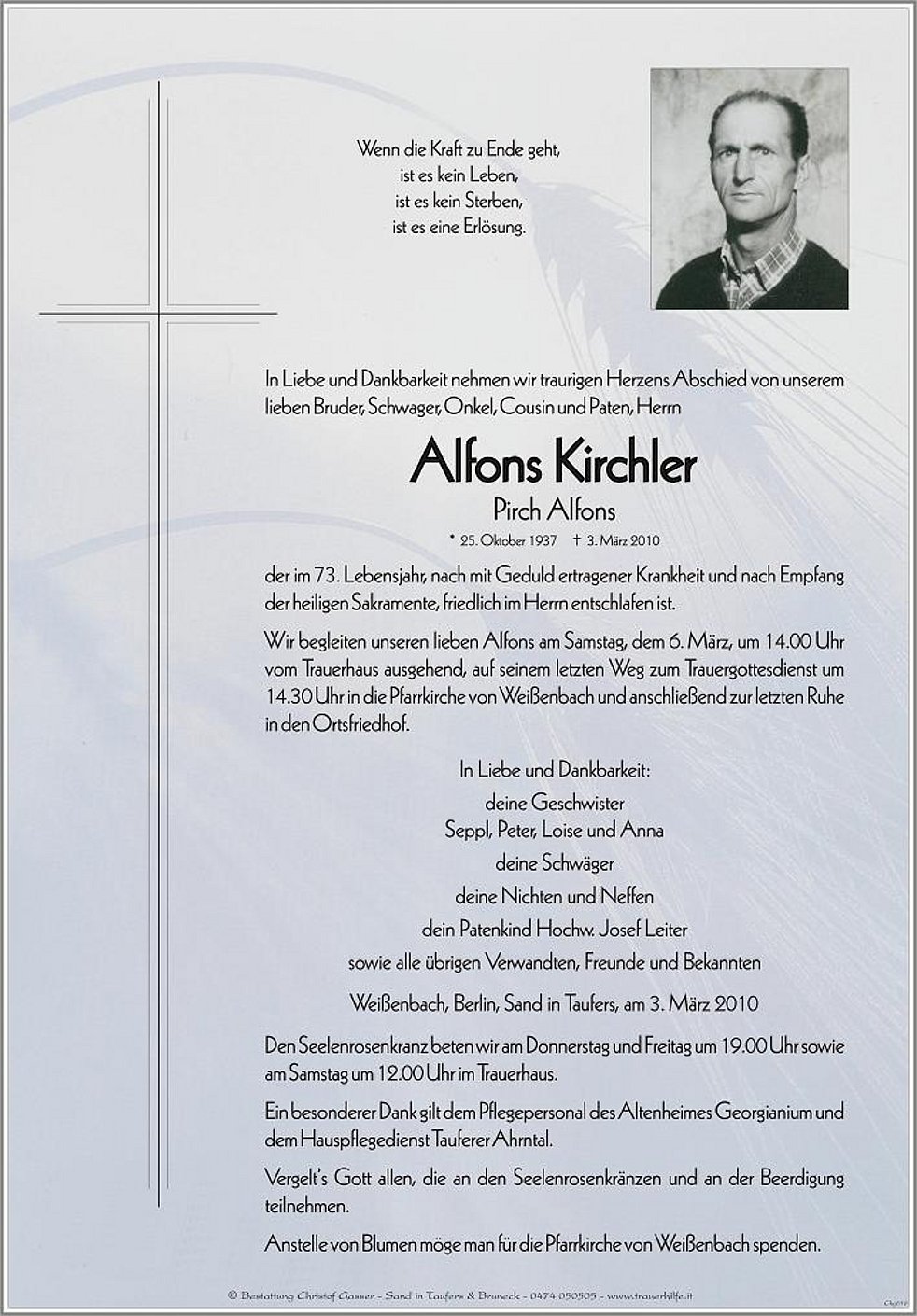 Wir begleiten unseren lieben Alfons am Samstag, dem 6. März, um 14.00 Uhr vom Trauerhaus ausgehend, auf seinem letzten Weg zum Trauergottesdienst um 14.30 Uhr in die Pfarrkirche von Weißenbach und anschließend zur letzten Ruhe in den Ortsfriedhof.
