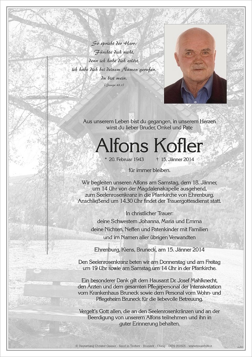 Vergelt’s Gott allen, die an den Seelenrosenkränzen und an der Beerdigung von unserem Alfons teilnehmen und ihn in