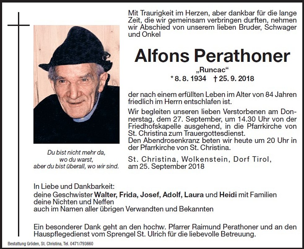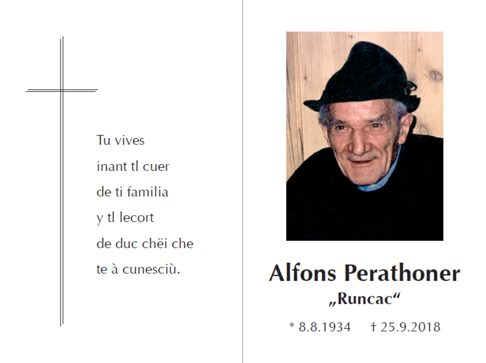 Ein besonderer Dank geht an den hochw. Pfarrer Raimund Perathoner und an den Hauspflegedienst vom Sprengel St. Ulrich für die liebevolle Betreuung.