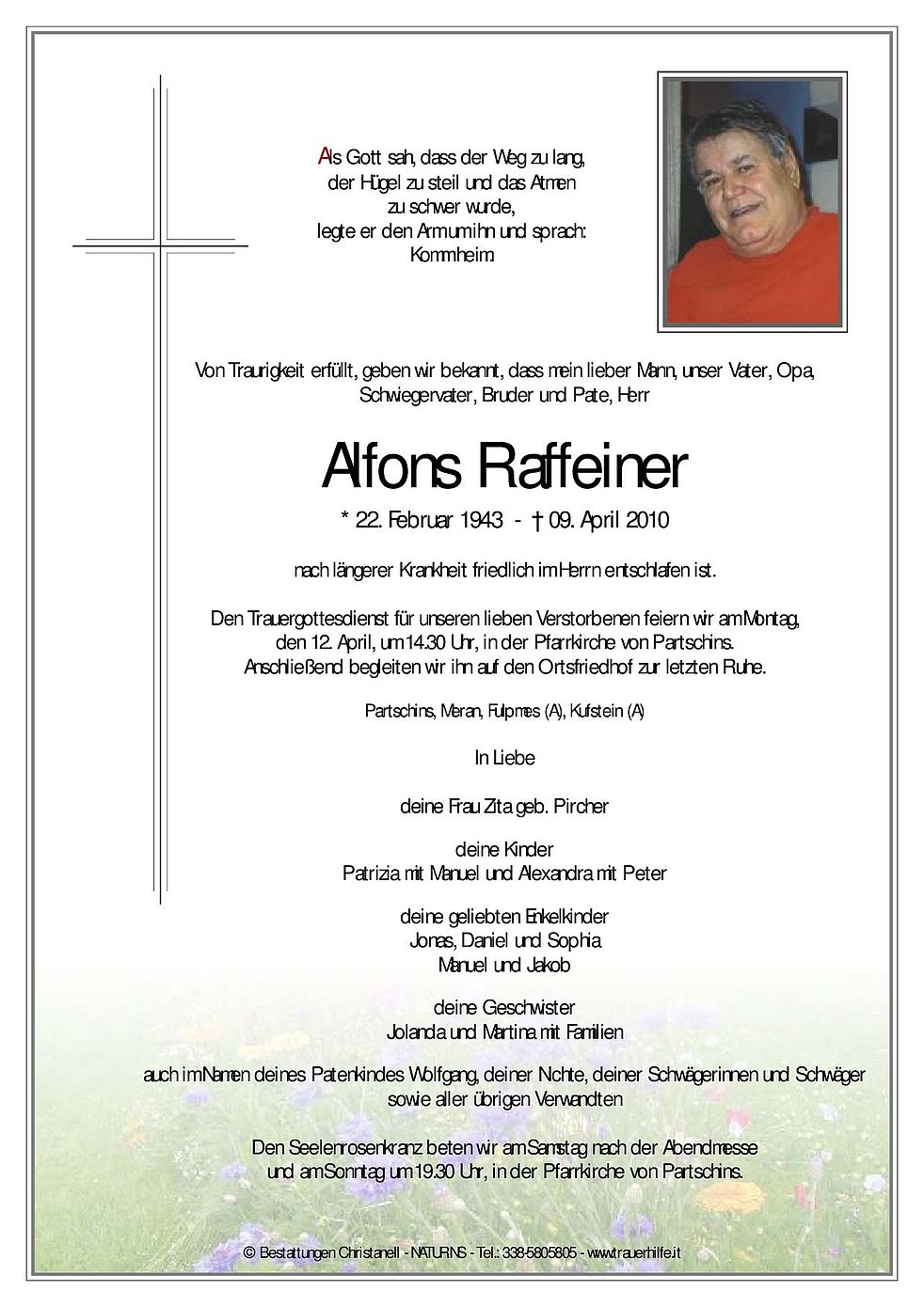 Den Trauergottesdienst für unseren lieben Verstorbenen feiern wir am Montag, den 12. April, um 14.30 Uhr, in der Pfarrkirche von Partschins. Anschließend begleiten wir ihn auf den Ortsfriedhof zur letzten Ruhe.