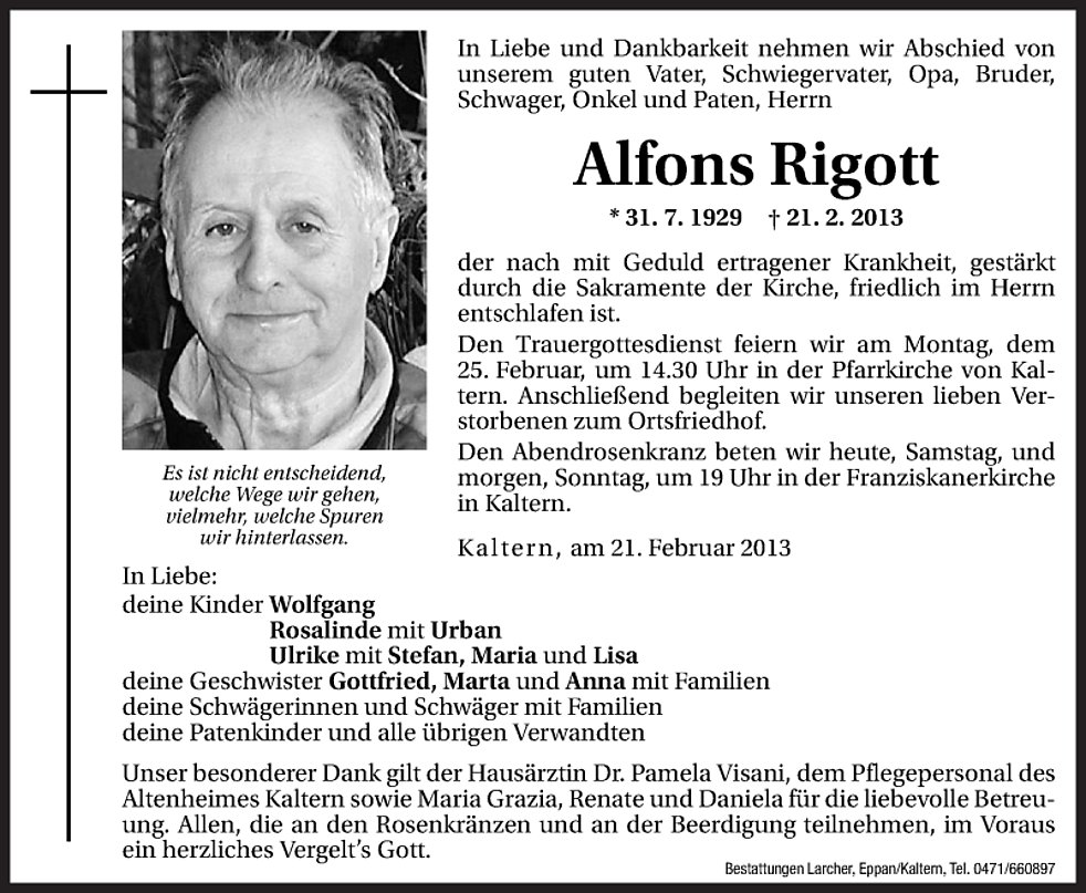 Unser besonderer Dank gilt der Hausärztin Dr. Pamela Visani, dem Pflegepersonal des Altenheimes Kaltern, sowie Maria Grazia, Renate und Daniela für die liebevolle Betreuung. Allen, die an den Rosenkränzen und an der Beerdigung teilnehmen, im Voraus ein herzliches Vergelt´s Gott.