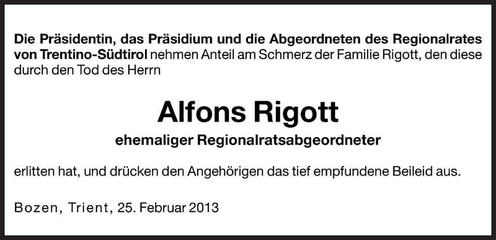 Den Trauergottesdienst feiern wir am Montag, den 25. Februar um 14.30 Uhr in der Pfarrkirche von Kaltern. Anschließend begleiten wir unseren lieben Verstorbenen zum Ortsfriedhof.