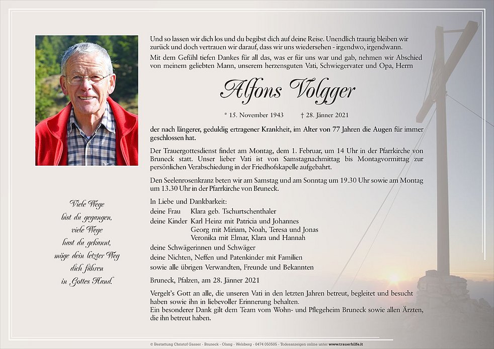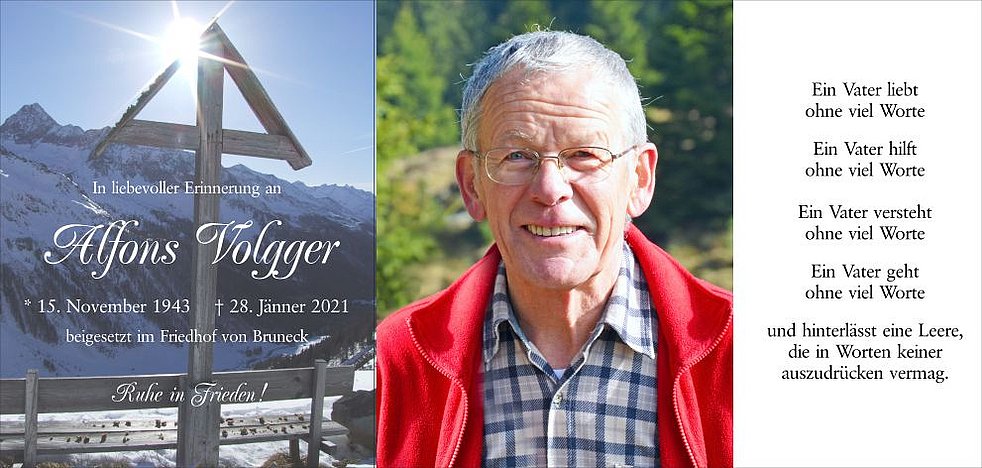 Der Trauergottesdienst findet am Montag, dem 1. Februar, um 14 Uhr in der Pfarrkirche von Bruneck statt. Unser lieber Vati ist von Samstagnachmittag bis Montagvormittag zur persönlichen Verabschiedung in der Friedhofskapelle aufgebahrt.