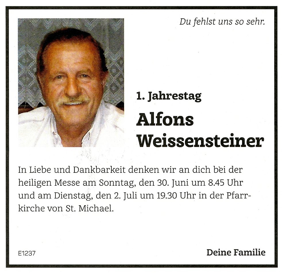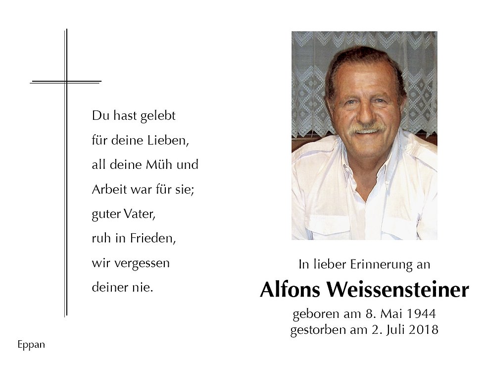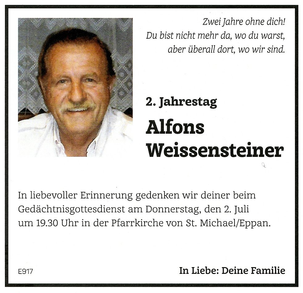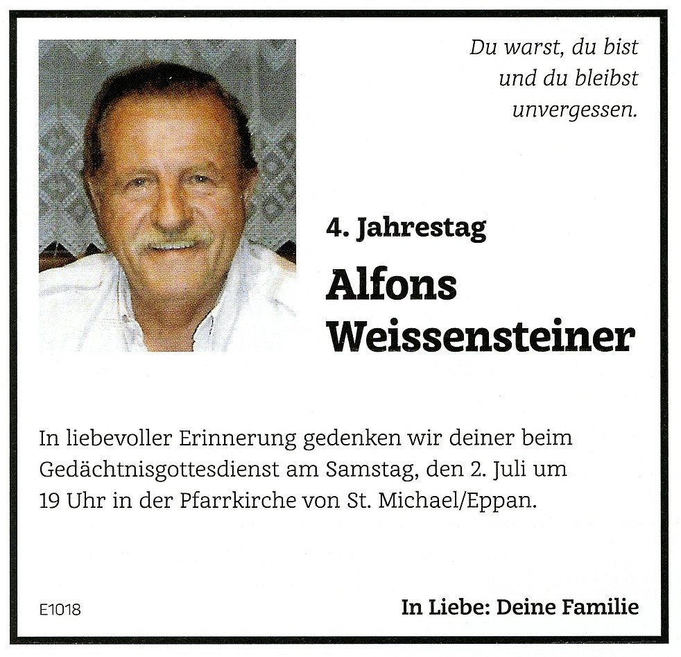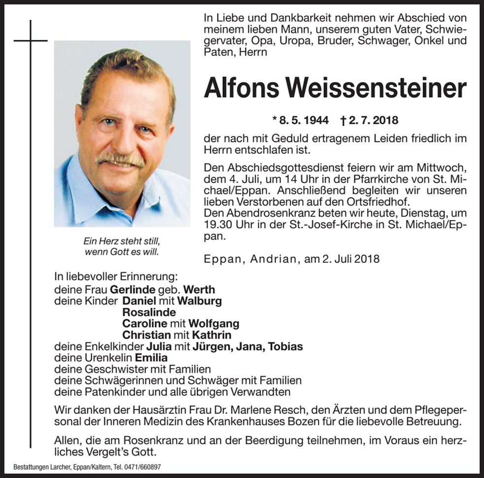 Den Abschiedsgottesdienst feiern wir am Mittwoch, dem 4. Juli um 14 Uhr in der Pfarrkirche von St. Michael/Eppan. Anschließend begleiten wir unseren lieben Verstorbenen auf den Ortsfriedhof.