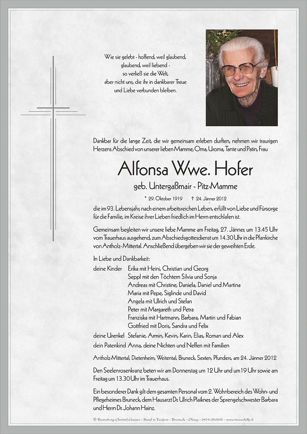 Gemeinsam begleiten wir unsere liebe Mamme am Freitag, 27. Jänner, um 13.45 Uhr vom Trauerhaus ausgehend, zum Abschiedsgottesdienst um 14.30 Uhr in die Pfarrkirche von Antholz- Mittertal. Anschließend übergeben wir sie der geweihten Erde.