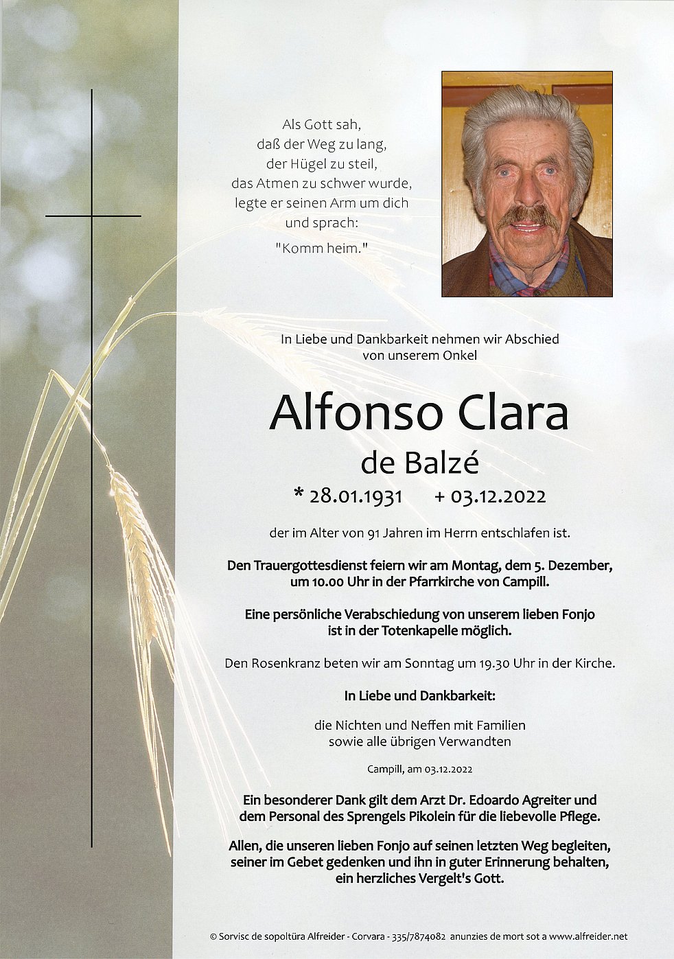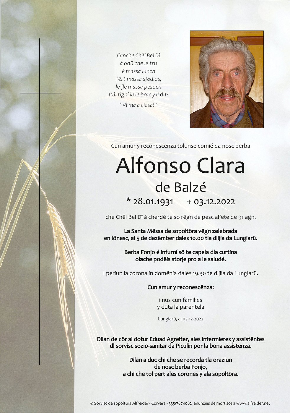 Den Trauergottesdienst feiern wir am Montag, dem 5. Dezember, um 10.00 Uhr in der Pfarrkirche von Campill.