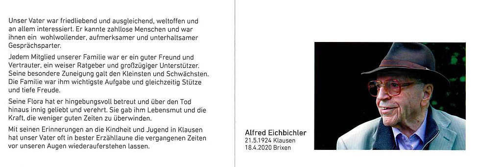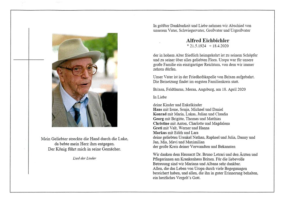 Unser Vater ist in der Friedhofskapelle von Brixen aufgebahrt. Die Beisetzung findet im engsten Familienkreis statt.
