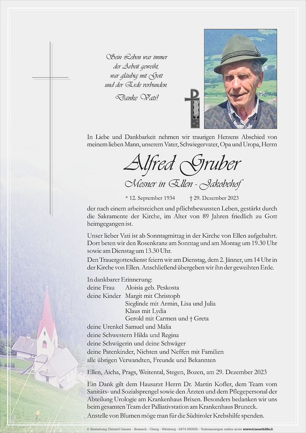 Den Trauergottesdienst feiern wir am Dienstag, dem 2. Jänner, um 14 Uhr in der Kirche von Ellen. Anschließend übergeben wir ihn der geweihten Erde.
