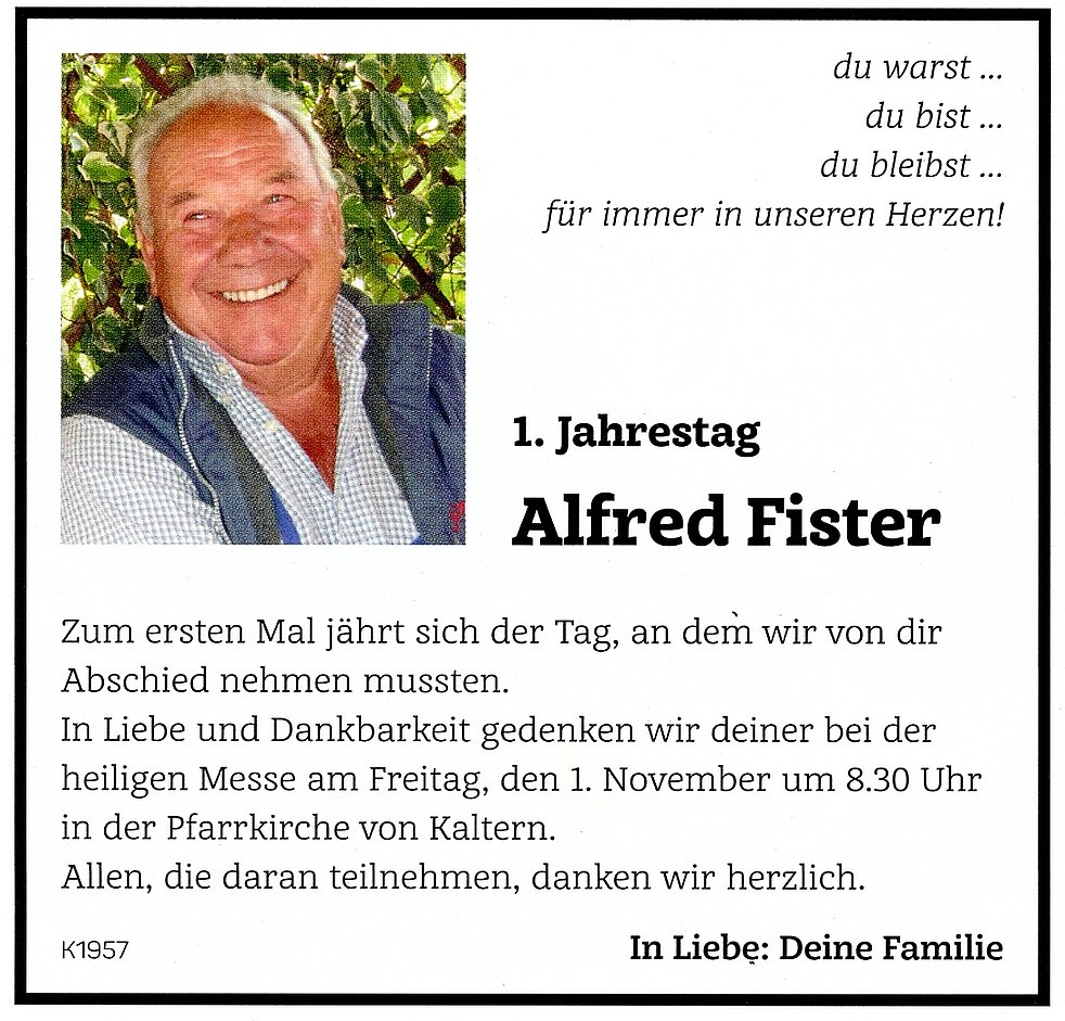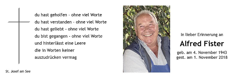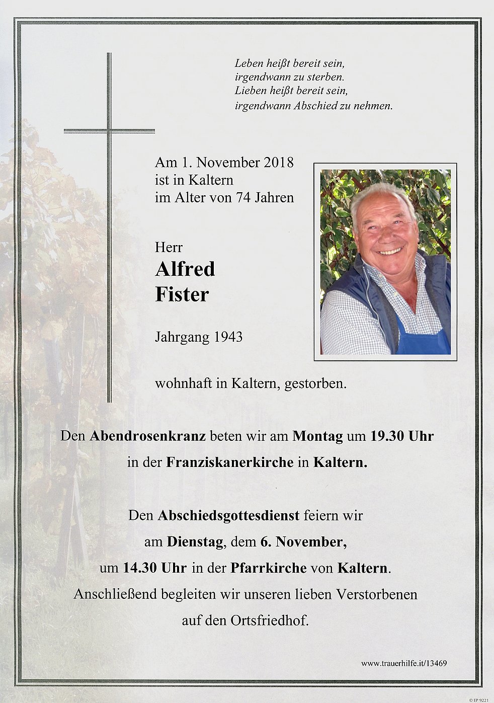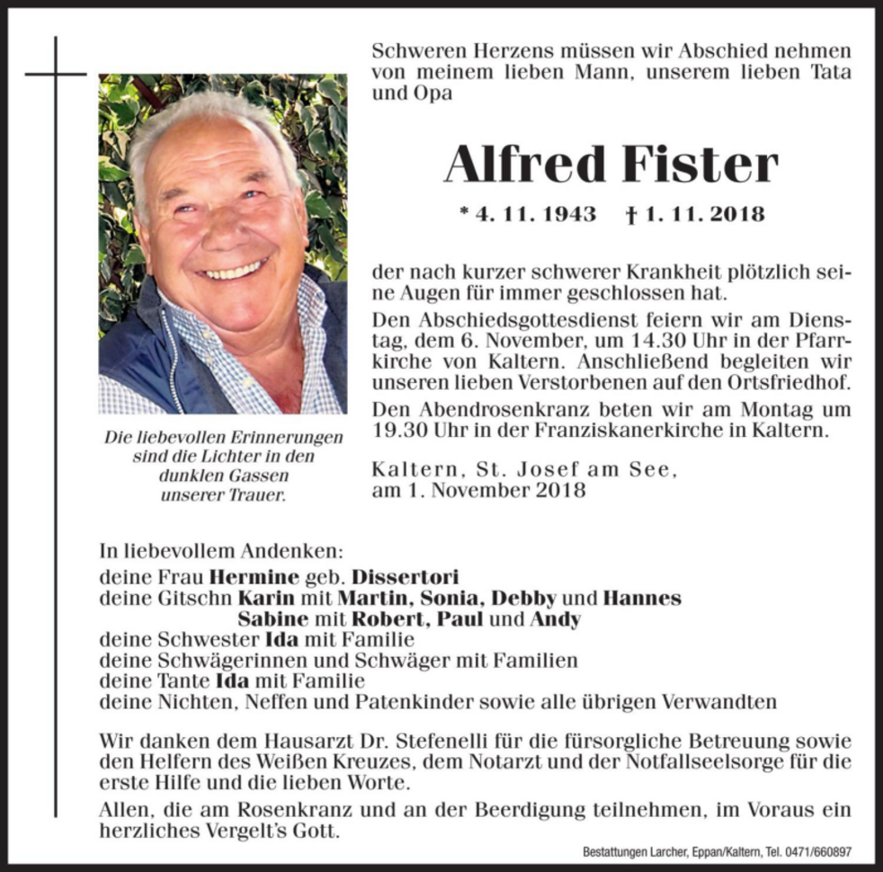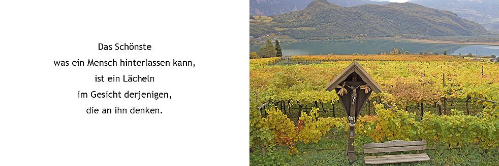 Den Abschiedsgottesdienst feiern wir am Dienstag, dem 6. November um 14.30 Uhr in der Pfarrkirche von Kaltern. Anschließend begleiten wir unseren lieben Verstorbenen auf den Ortsfriedhof.