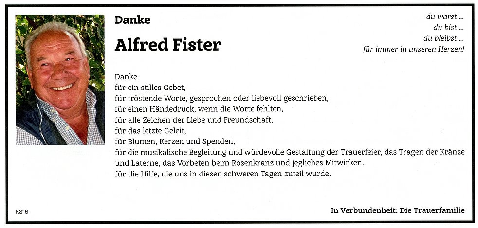 Wir danken dem Hausarzt Dr. Stefenelli für die fürsorgliche Betreuung sowie den Helfern des Weißen Kreuzes, dem Notarzt und der Notfallseelsorge für die erste Hilfe und die lieben Worte.