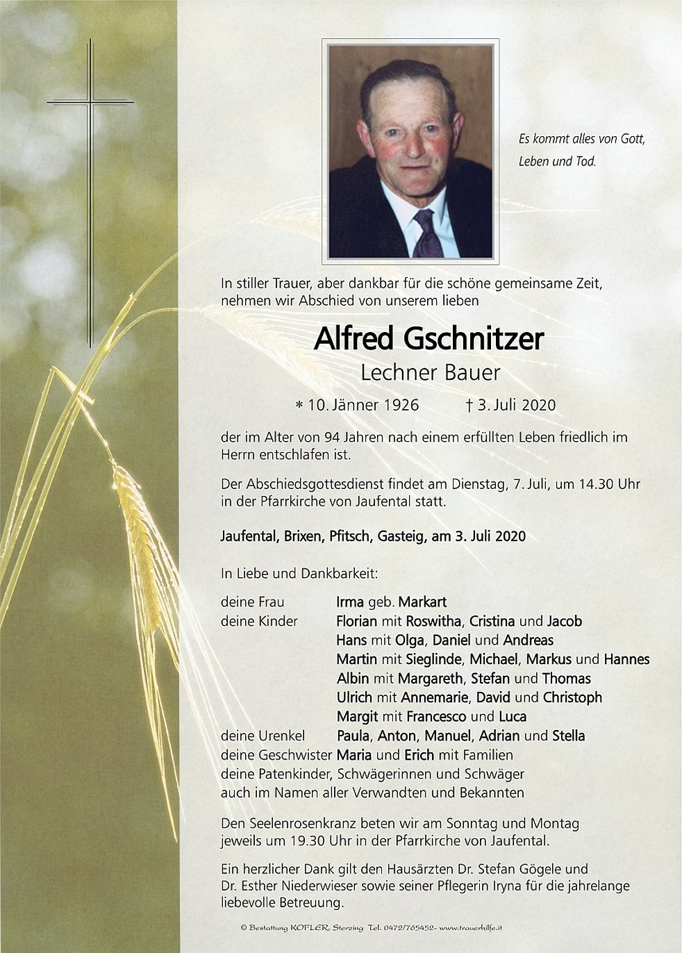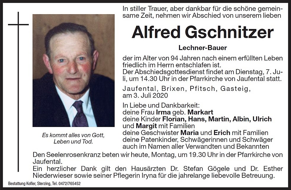 Ein herzlicher Dank gilt den Hausärzten Dr. Stefan Gögele und Dr. Esther Niederwieser sowie seiner Pflegerin Iryna für die jahrelange liebevolle Betreuung.