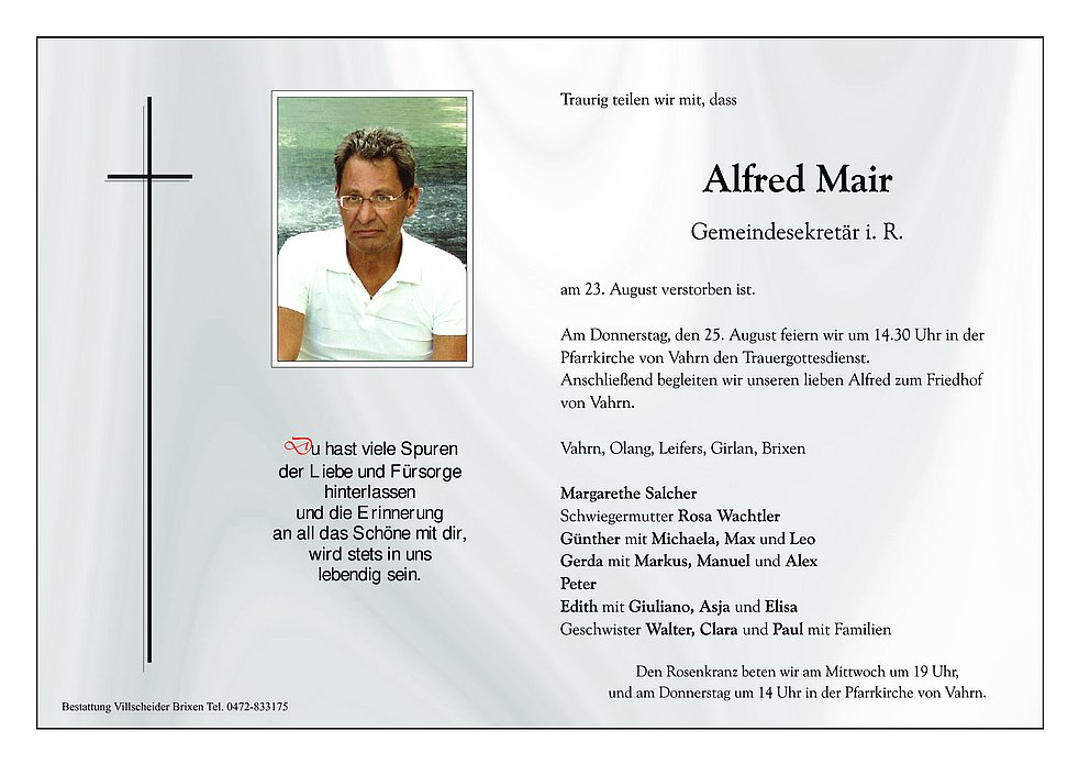 Am Donnerstag, den 25. August feiern wir um 14.30 Uhr in der Pfarrkirche von Vahrn den Trauergottesdienst.