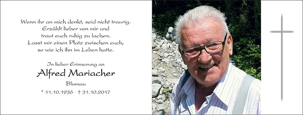 Den Trauergottesdienst mit anschließender Verabschiedung feiern wir am Samstag, 4. November, um 14.30 Uhr in der Pfarrkirche von Blumau.