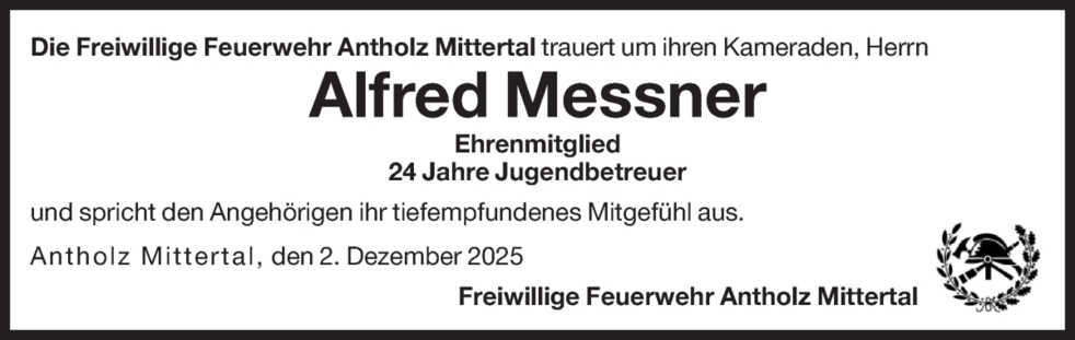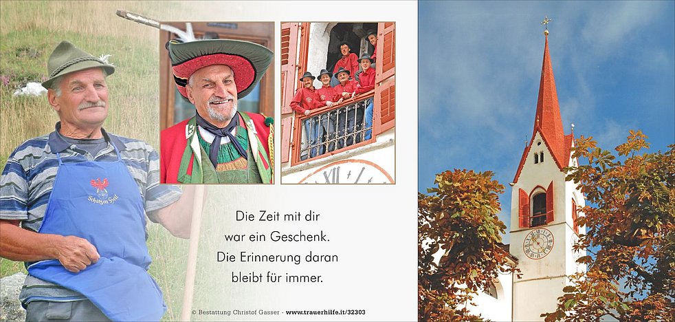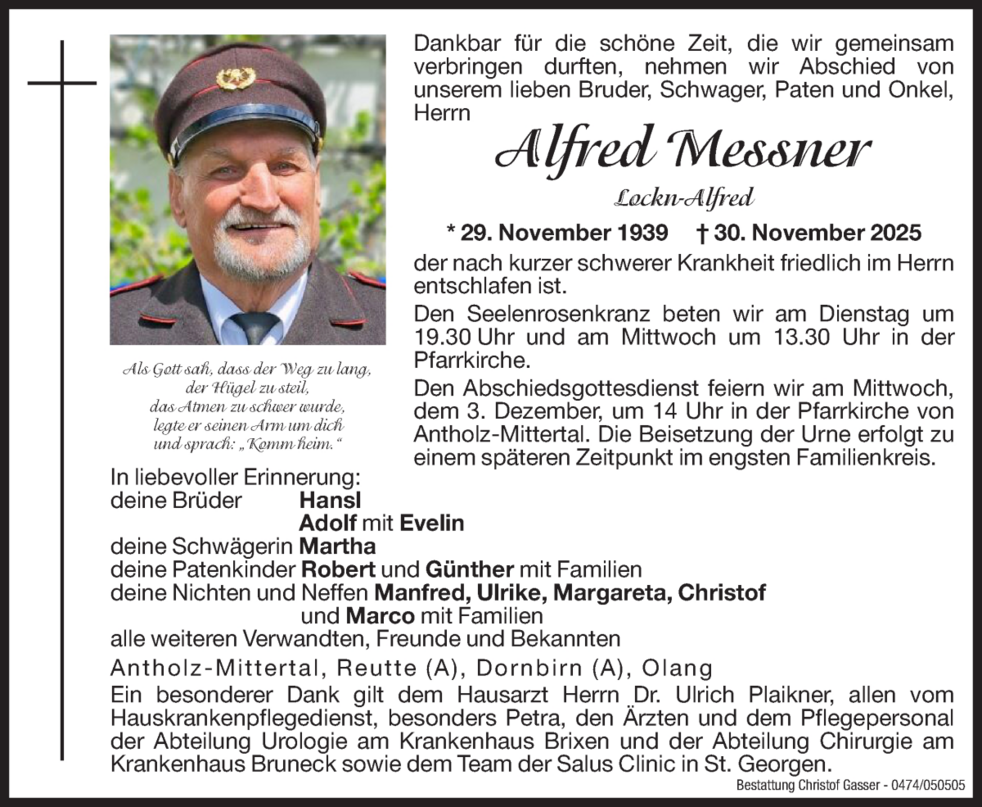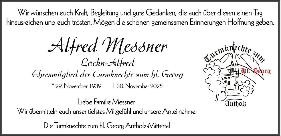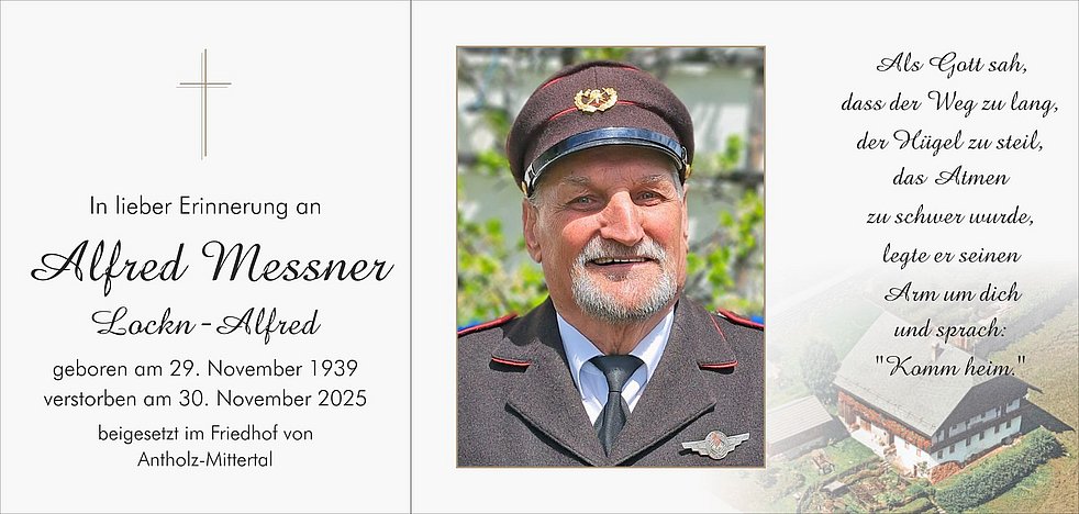 Den Abschiedsgottesdienst feiern wir am Mittwoch, dem 3. Dezember, um 14 Uhr in der Pfarrkirche von Antholz-Mittertal. Die Beisetzung der Urne erfolgt zu einem späteren Zeitpunkt im engsten Familienkreis.