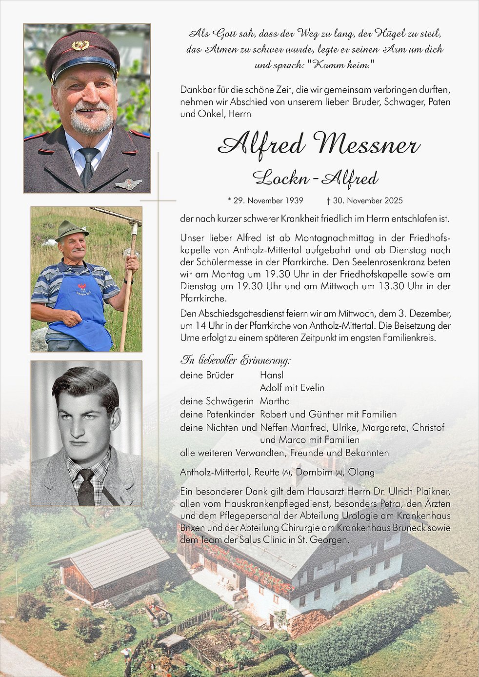 Unser lieber Alfred ist ab Montagnachmittag in der Friedhofs-kapelle von Antholz-Mittertal aufgebahrt und ab Dienstag nach der Schülermesse in der Pfarrkirche. Den Seelenrosenkranz beten wir am Montag um 19.30 Uhr in der Friedhofskapelle sowie am Dienstag um 19.30 Uhr und am Mittwoch um 13.30 Uhr in der Pfarrkirche.