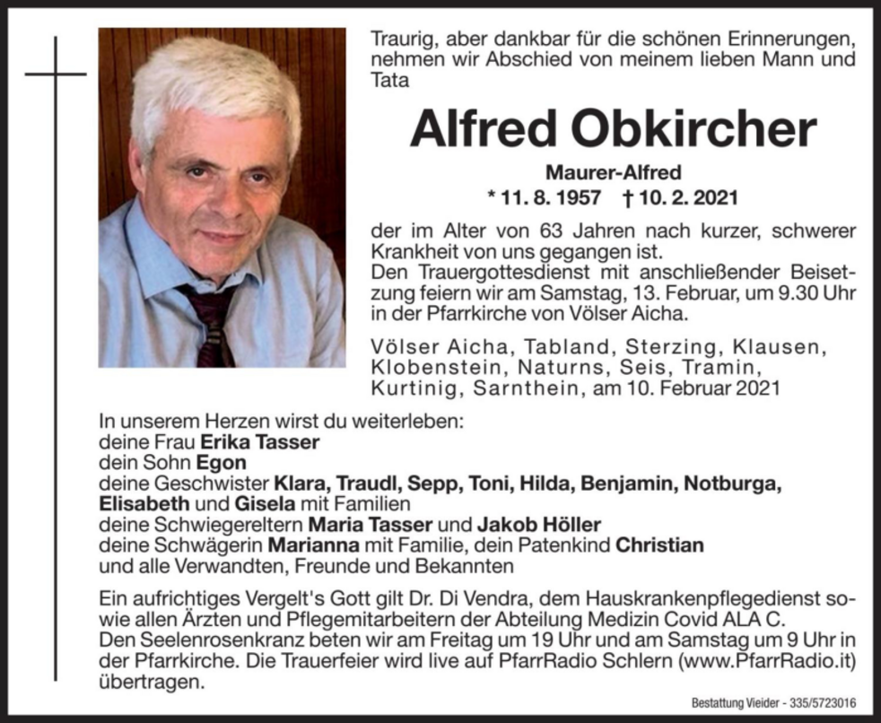 Den Trauergottesdienst mit anschließender Beisetzung feiern wir am Samstag, 13. Februar, um 9.30 Uhr in der Pfarrkirche von Völser Aicha.