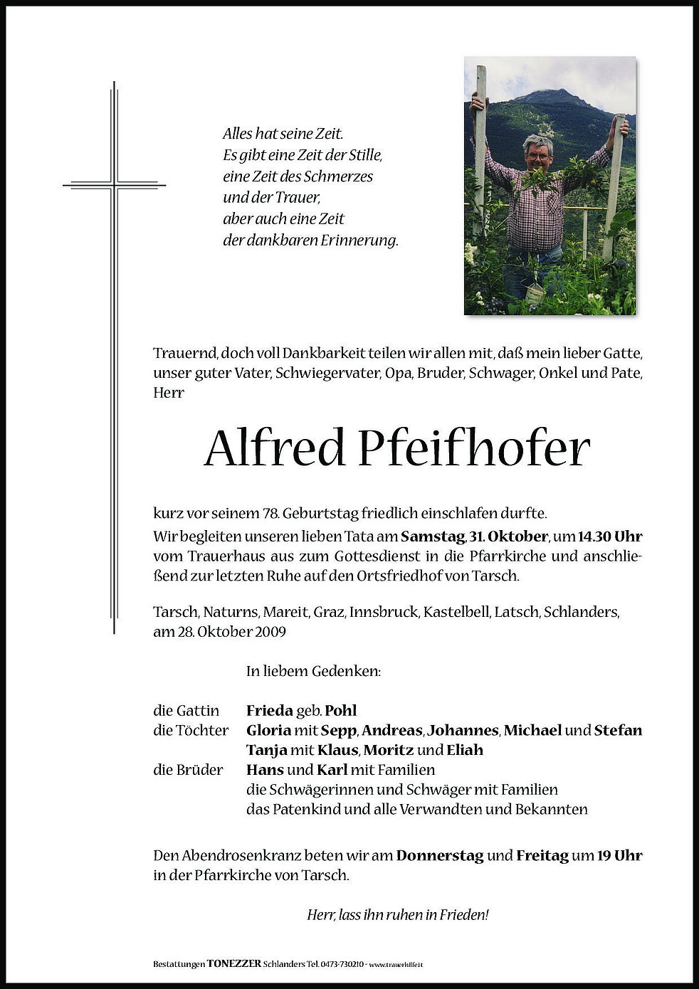 Wir begleiten unseren lieben Tata am Samstag, 31. Oktober, um 14.30 Uhr vom Trauerhaus aus zum Gottesdienst in die Pfarrkirche und anschließend zur letzten Ruhe auf den Ortsfriedhof von Tarsch.