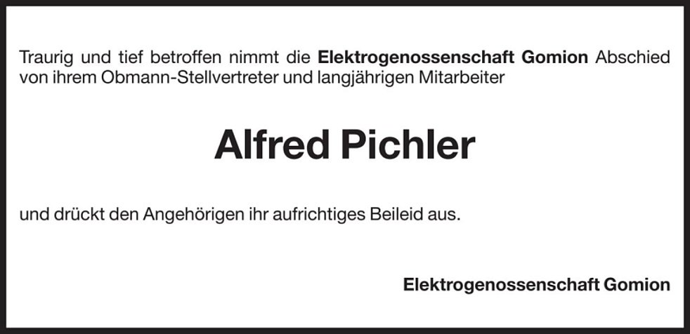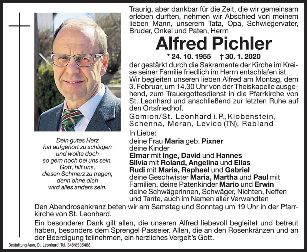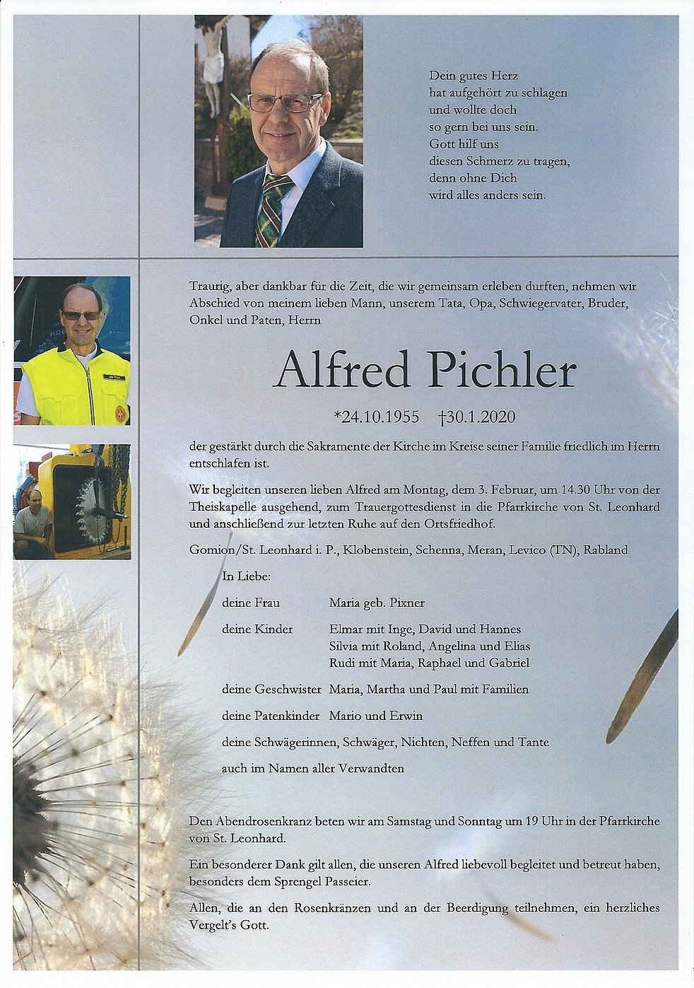 Wir begleiten unseren lieben Alfred am Montag, dem 3. Februar, um 14.30 Uhr von der Theiskapelle ausgehend, zum Trauergottesdienst in die Pfarrkirche von St. Leonhard und anschließend zur letzten Ruhe auf den Ortsfriedhof.