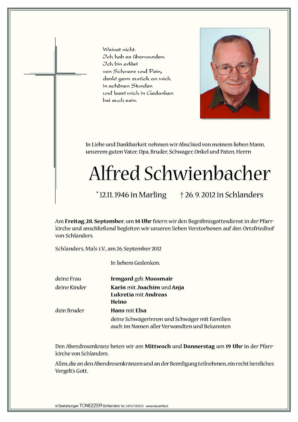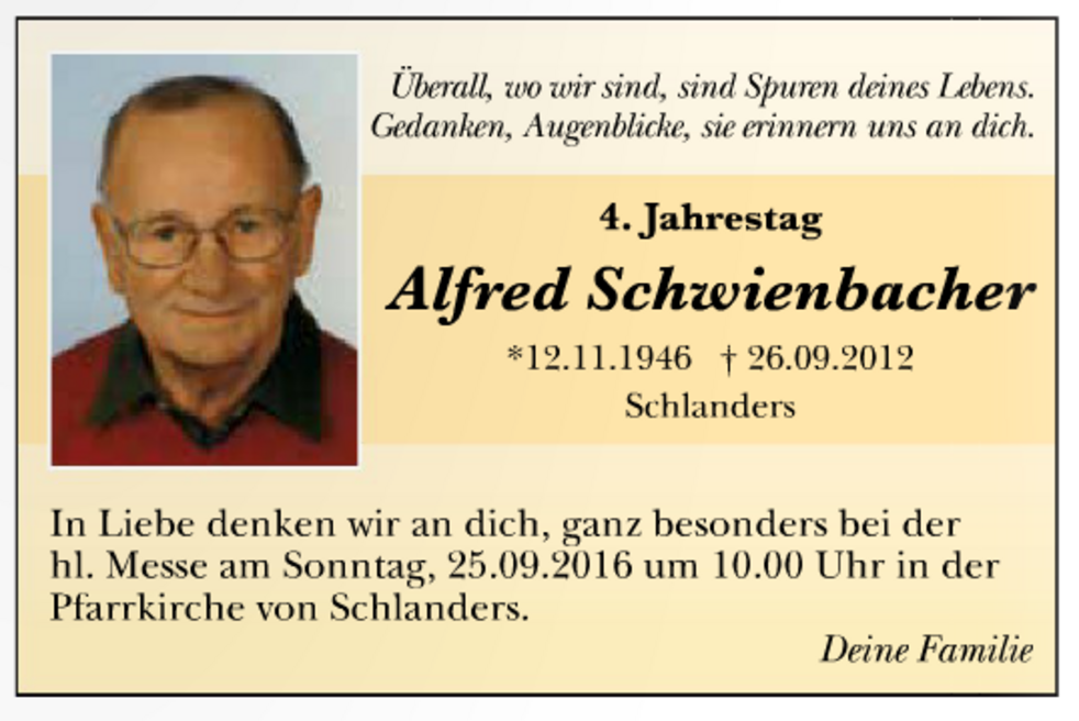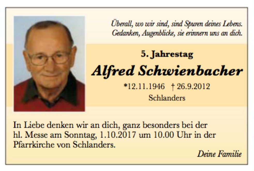 Am Freitag, 28. September, um 14 Uhr feiern wir den Begräbnisgottesdienst in der Pfarrkirche und anschließend begleiten wir unseren lieben Verstorbenen auf den Ortsfriedhof von Schlanders.