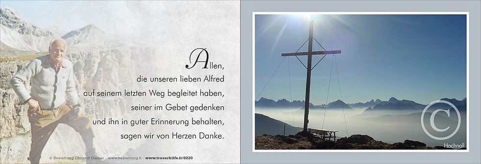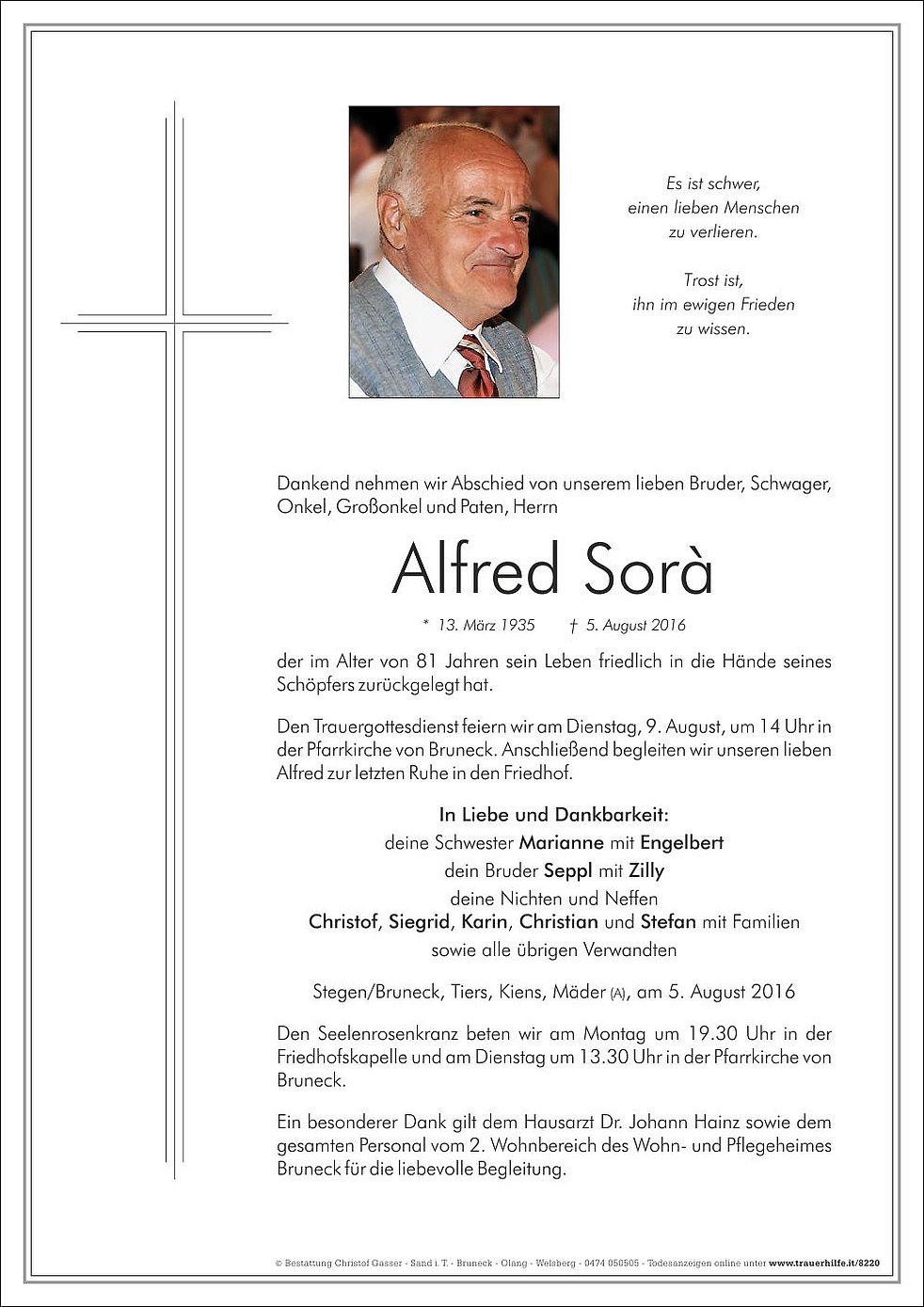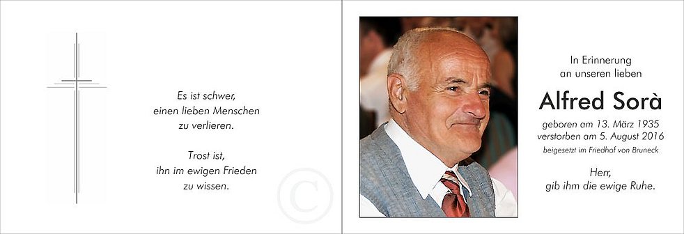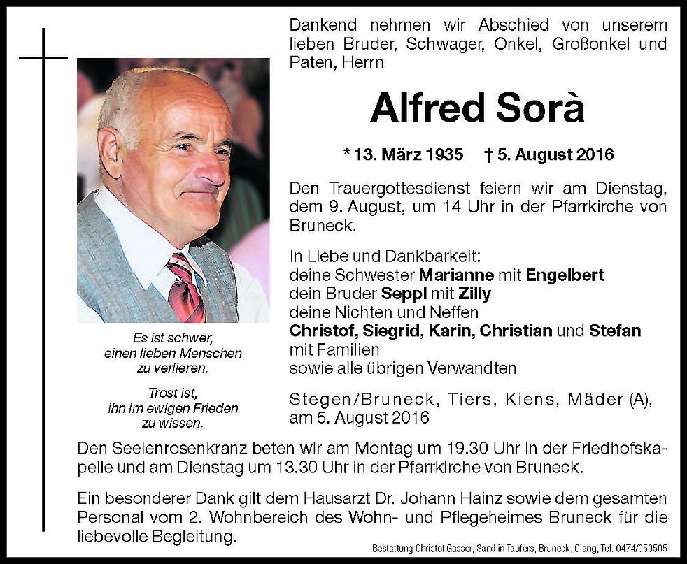 Den Trauergottesdienst feiern wir am Dienstag, 9. August, um 14 Uhr in der Pfarrkirche von Bruneck. Anschließend begleiten wir unseren lieben Alfred zur letzten Ruhe in den Friedhof.