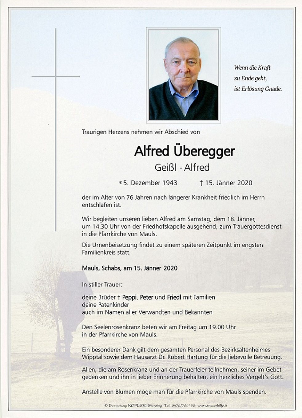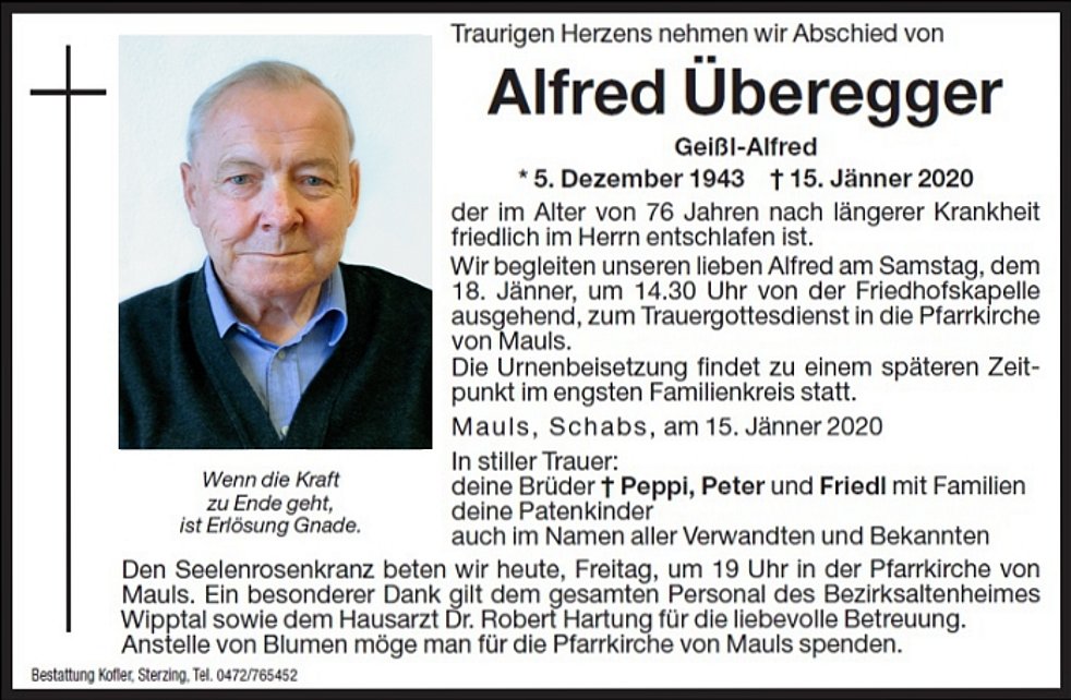 Wir begleiten unseren lieben Alfred am Samstag, dem 18. Jänner, um 14.30 Uhr von der Friedhofskapelle ausgehend, zum Trauergottesdienst in die Pfarrkirche von Mauls.