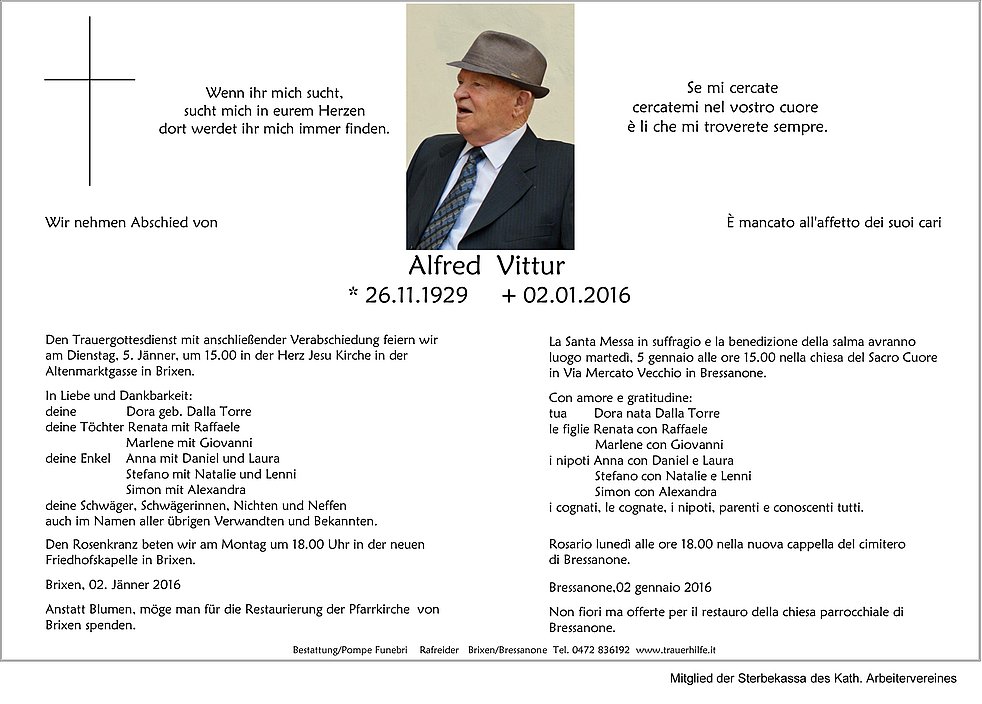 Den Trauergottesdienst mit anschließender Verabschiedung feiern wir am Dienstag, 5. Jänner, um 15.00 in der Herz Jesu Kirche in der Altenmarktgasse in Brixen.