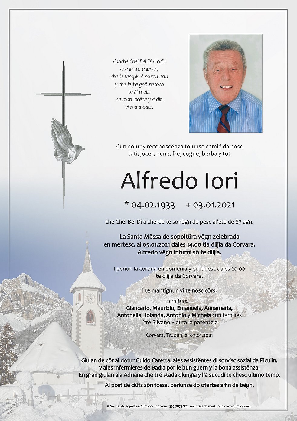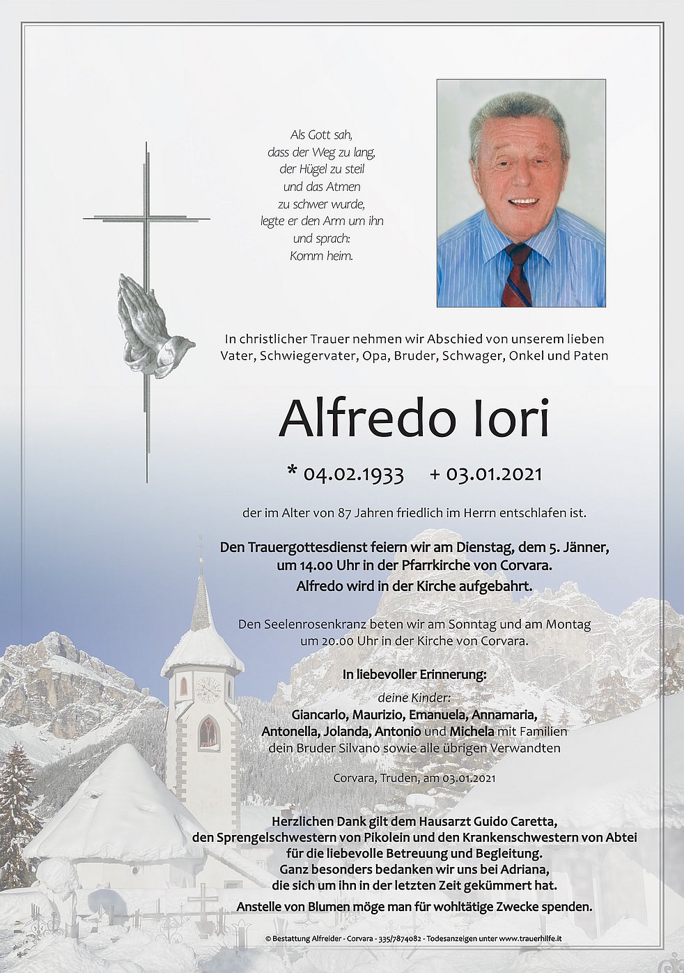 Den Trauergottesdienst feiern wir am Dienstag, dem 5. Jänner, um 14.00 Uhr in der Pfarrkirche von Corvara.