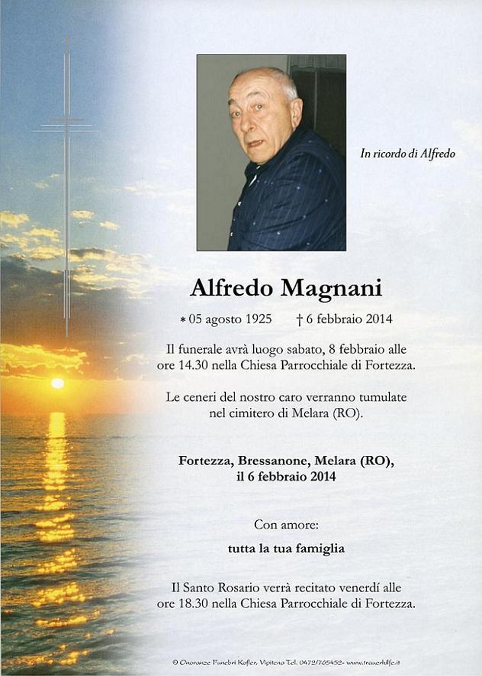 Il funerale avrà luogo sabato, 8 febbraio alle ore 14.30 nella Chiesa Parrocchiale di Fortezza.