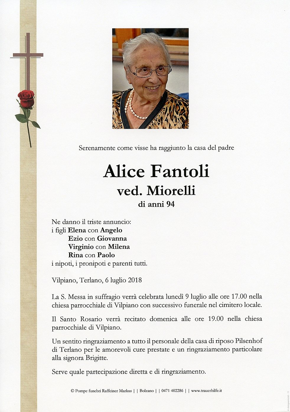 La S. Messa in suffragio verrà celebrata lunedì 9 luglio alle ore 17.00 nella chiesa parrocchiale di Vilpiano con successivo funerale nel cimitero locale.