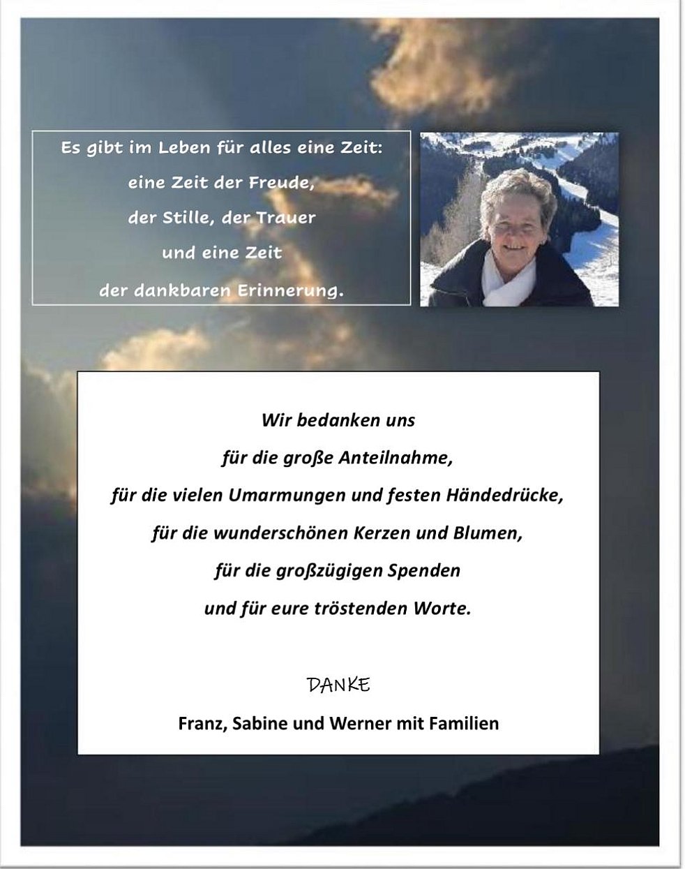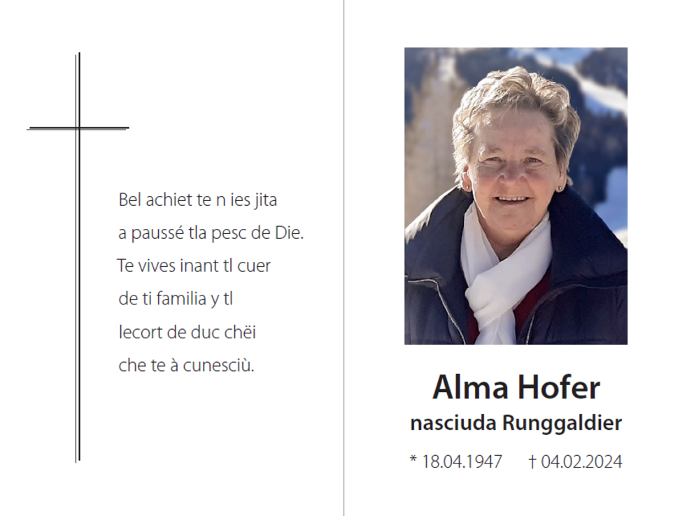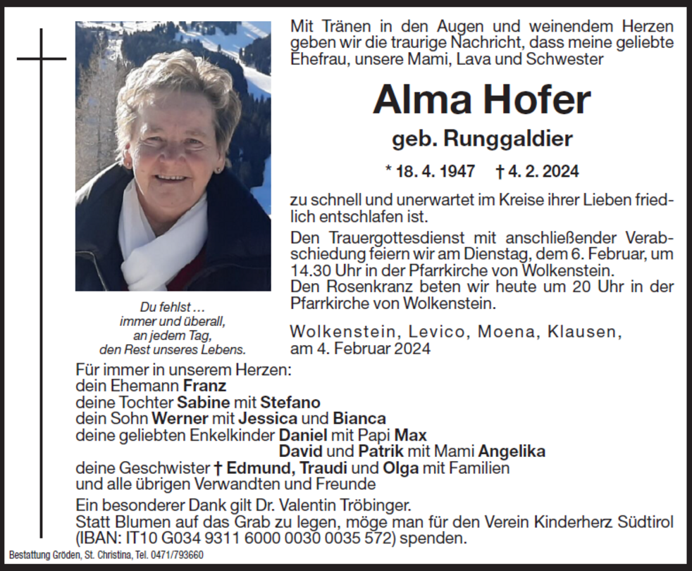Den Trauergottesdienst mit anschließender Verabschiedung feiern wir am Dienstag, dem 06. Februar, um 14.30 Uhr in der Pfarrkirche von Wolkenstein.