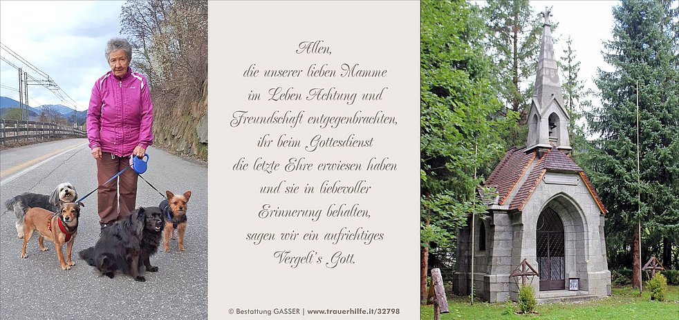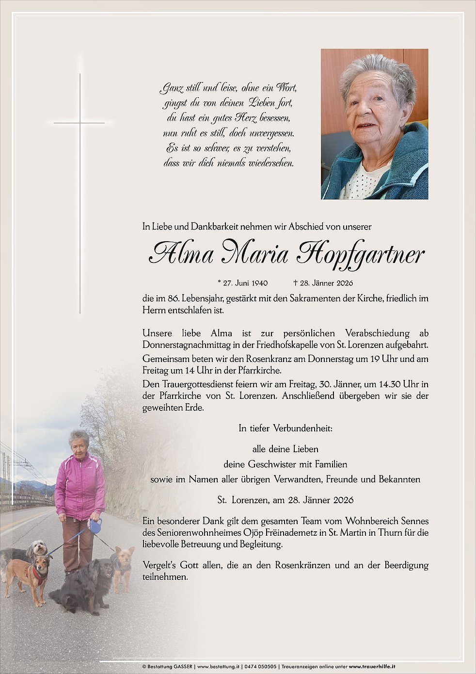 Den Trauergottesdienst feiern wir am Freitag, 30. Jänner, um 14.30 Uhr in der Pfarrkirche von St. Lorenzen. Anschließend übergeben wir sie der geweihten Erde.