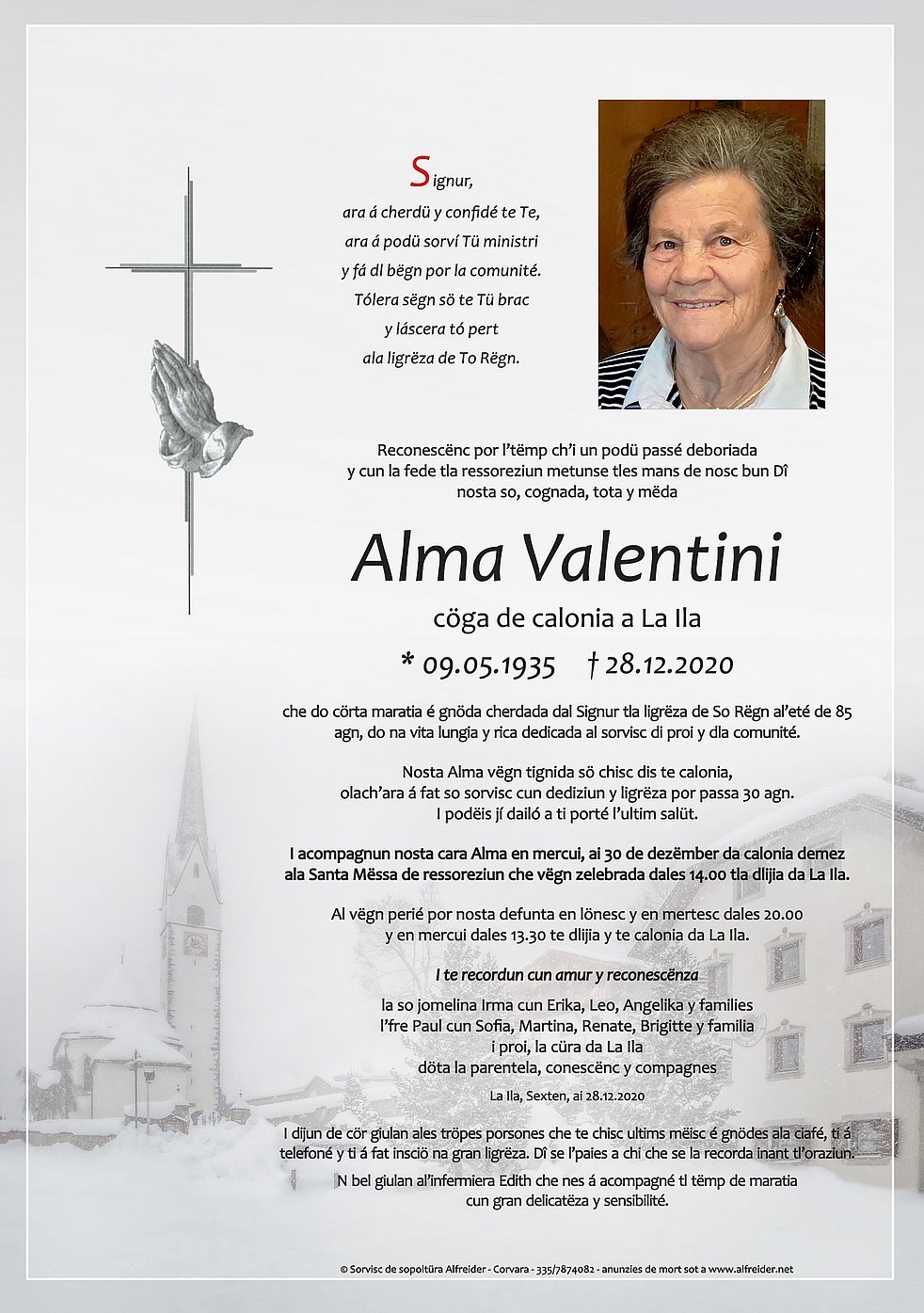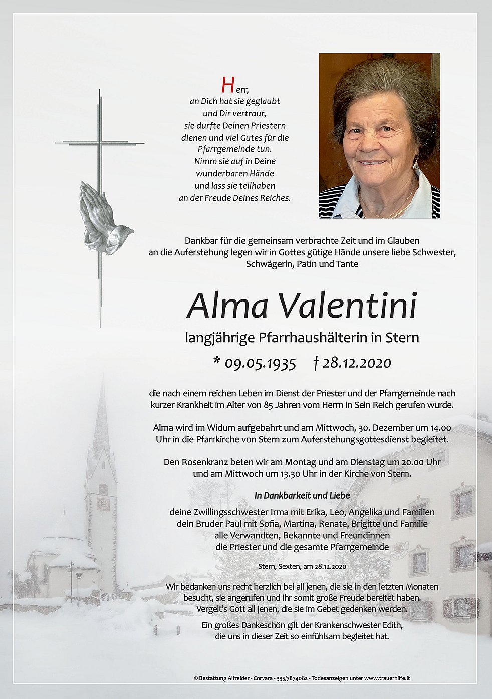 Alma wird im Widum aufgebahrt und am Mittwoch, 30. Dezember um 14.00 Uhr in die Pfarrkirche von Stern zum Auferstehungsgottesdienst begleitet.