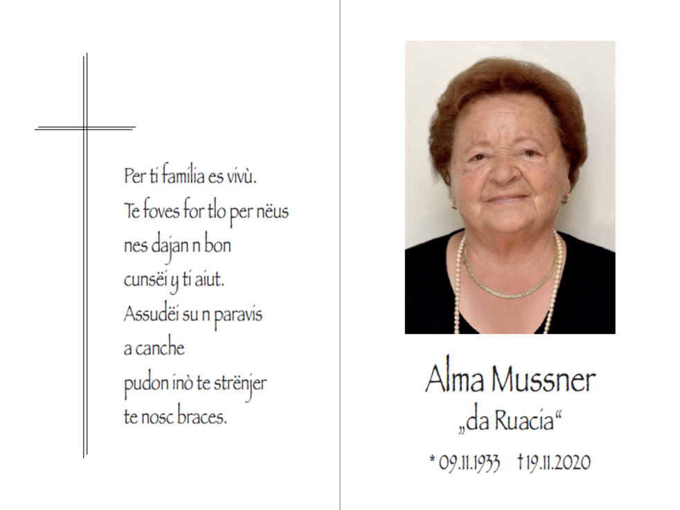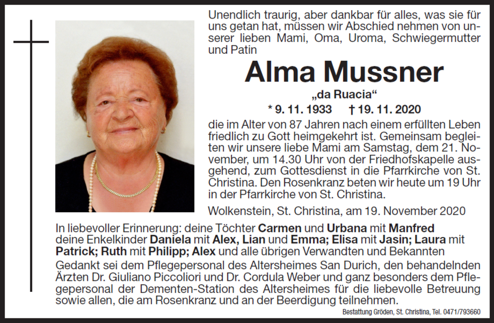 Gedankt sei dem Pflegepersonal des Altersheimes San Durich, den behandelnden Ärzten Dr. Giuliano Piccoliori und Dr. Cordula Weber und ganz besonders dem Pflegepersonal der Dementen Station des Altersheimes für die liebevolle Betreuung, sowie allen, die am Rosenkranz und an der Beerdigung teilnehmen.
