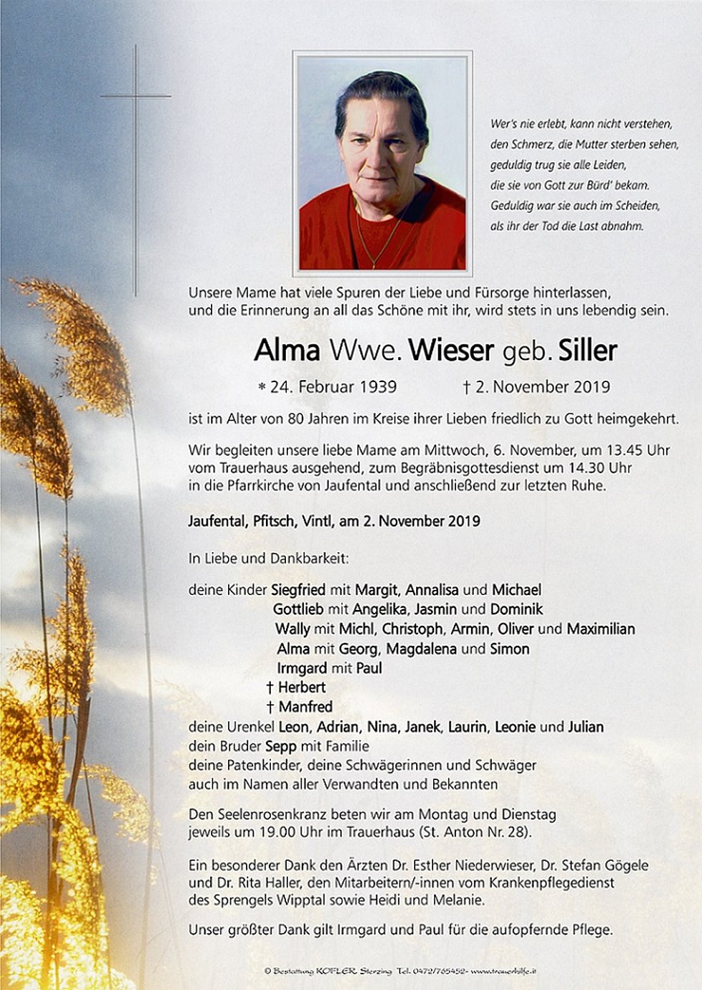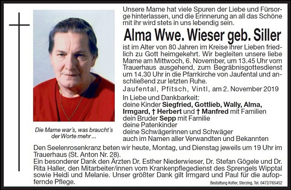 Wir begleiten unsere liebe Mame am Mittwoch, 6. November, um 13.45 Uhr vom Trauerhaus ausgehend, zum Begräbnisgottesdienst um 14.30 Uhr in die Pfarrkirche von Jaufental und anschließend zur letzten Ruhe.