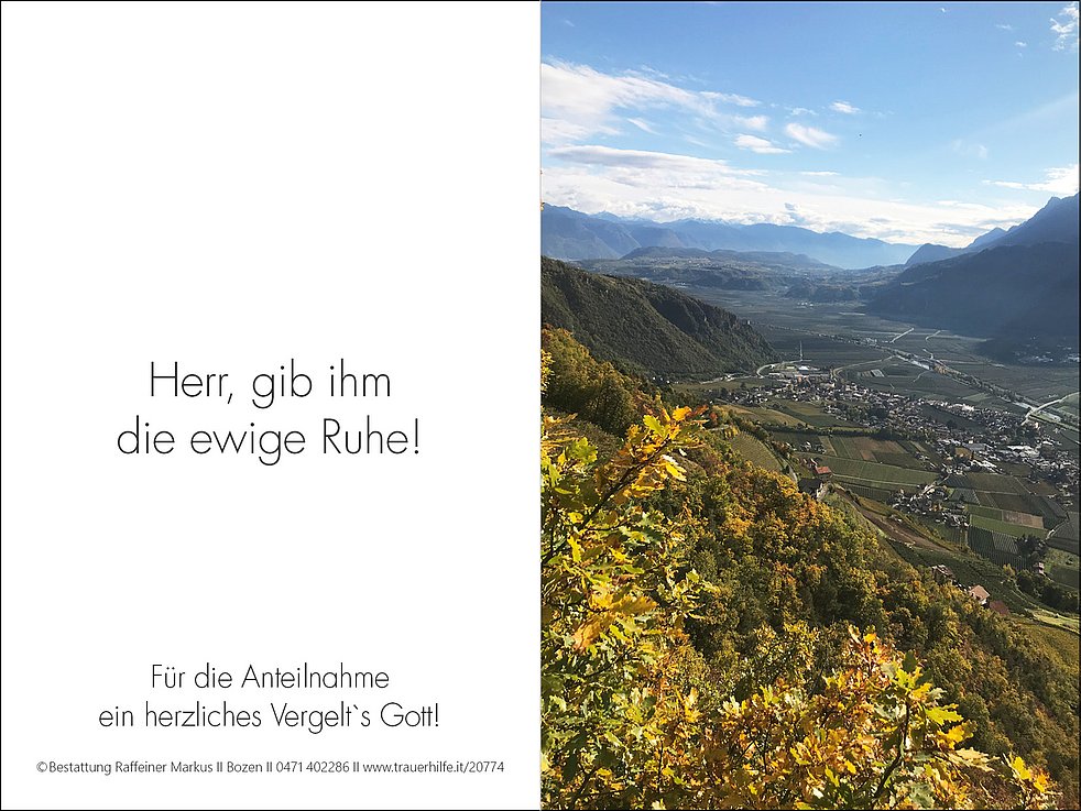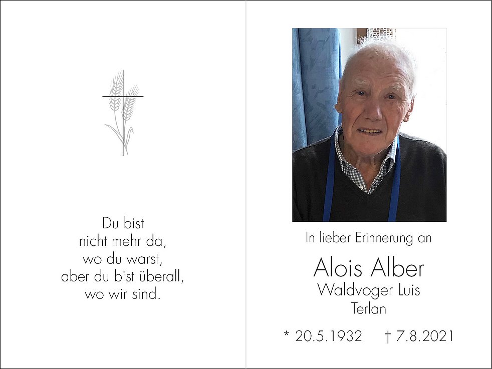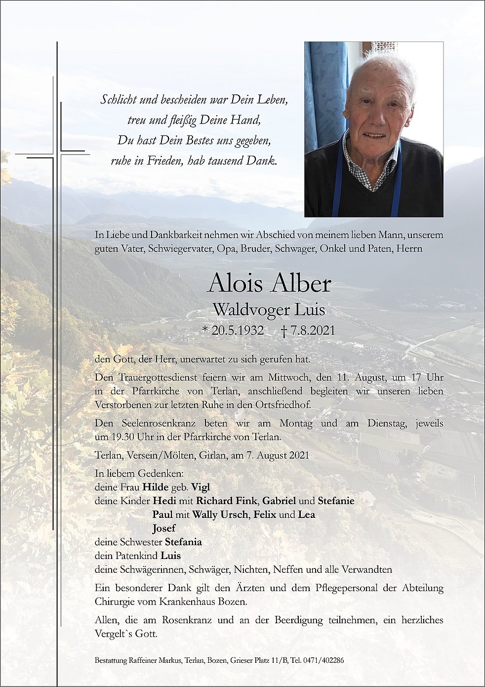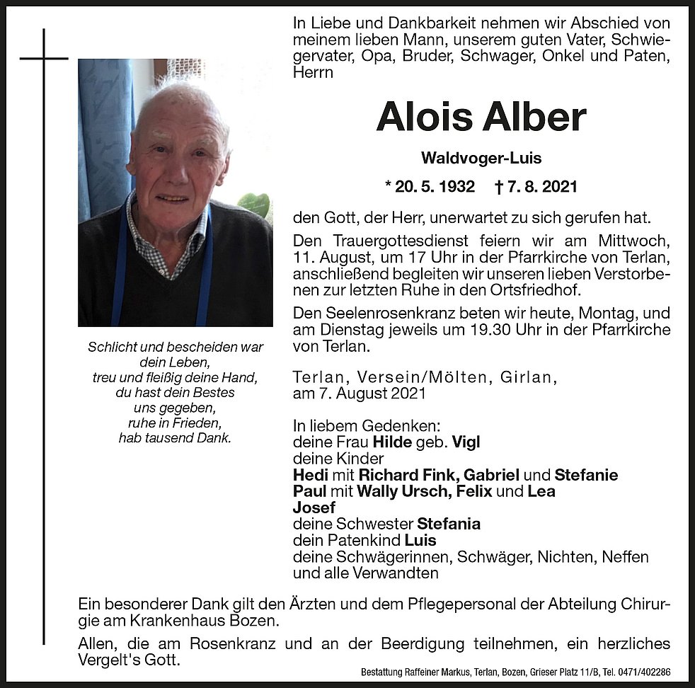 Den Trauergottesdienst feiern wir am Mittwoch, den 11. August, um 17 Uhr in der Pfarrkirche von Terlan, anschließend begleiten wir unseren lieben Verstorbenen zur letzten Ruhe in den Ortsfriedhof.